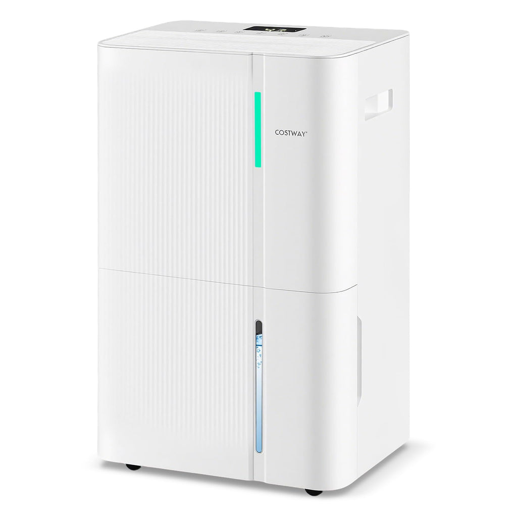 Whether you're looking to improve humidity control in your bathroom, bedroom, living room or basement, this dehumidifier offers a specialized solution that operates quietly and efficiently. It features 3 working modes, offering tailored humidity management for diverse situations. The smart touch panel with LED display makes it easy to operate while the 3-color indicator provides a clear status of the current humidity levels. Additionally, you can use the built-in timer to set periods up to 24 hours for automatic shut off or turn on. The included drain hose offers a convenient way to drain, eliminating the need for frequent emptying of the tank. Moreover, the dehumidifier features recess handles and universal wheels for effortless movement.