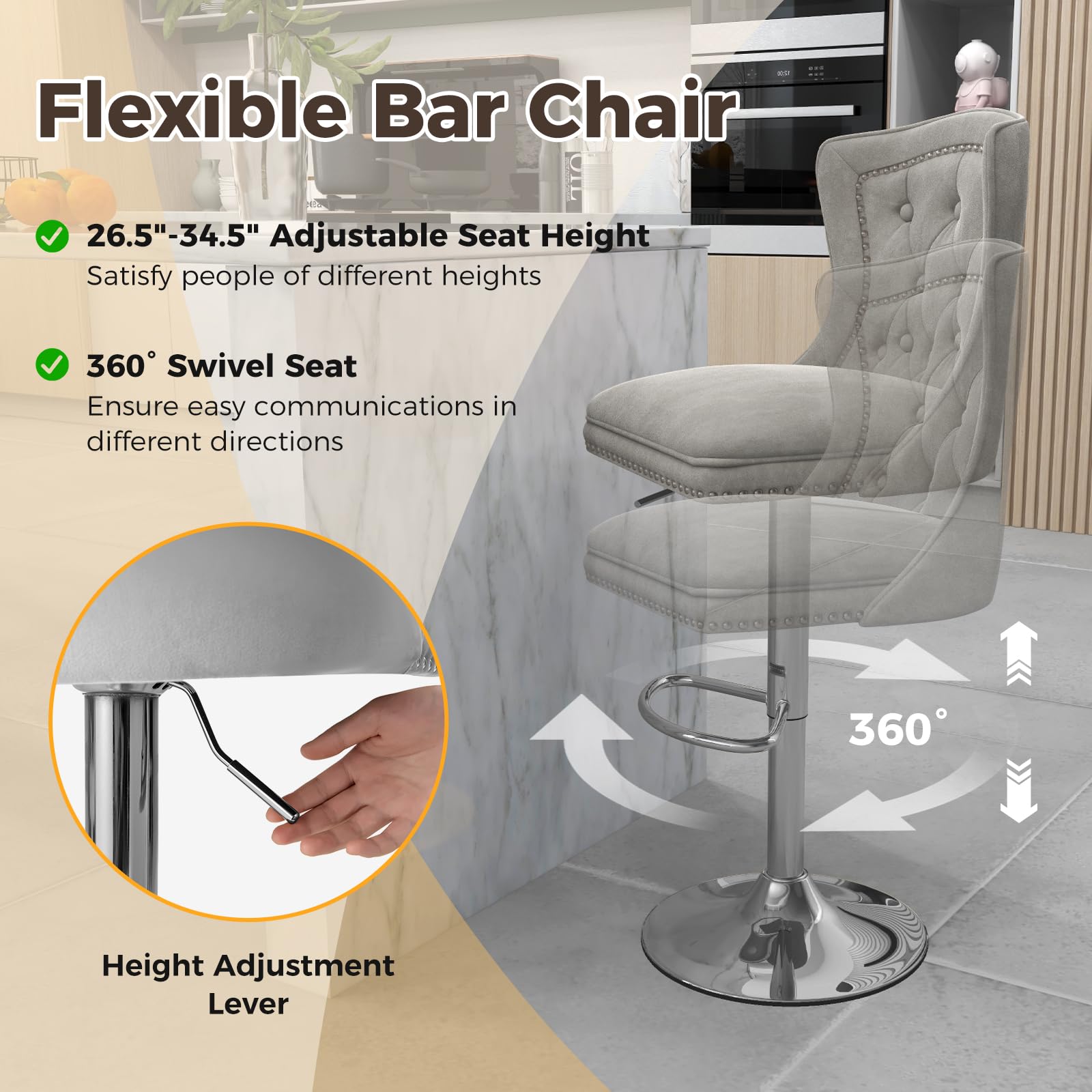 Indulge in luxurious comfort with our exquisite bar chair set. Upholstered in cozy dutch velvet, these bar chairs provide unmatched coziness, complemented by elastic sponge fillings. The ergonomic backrests and footrests ensure optimal support, reducing fatigue. Customizable to individual preferences, each bar stool offers an adjustable height range from 26.5β to 34.5β. The 360Β° swivel seats facilitate seamless socializing in any direction. Exceptional stability is ensured by the robust SGS gas rod and electroplated metal base, supporting weights of up to 330 lbs. Aesthetic charm is embodied in charming accents like delicate rivets and tufted buttons. In addition to bars, they effortlessly elevate kitchens and dining rooms. Simple assembly is ensured with the help of a clear manual.