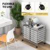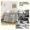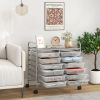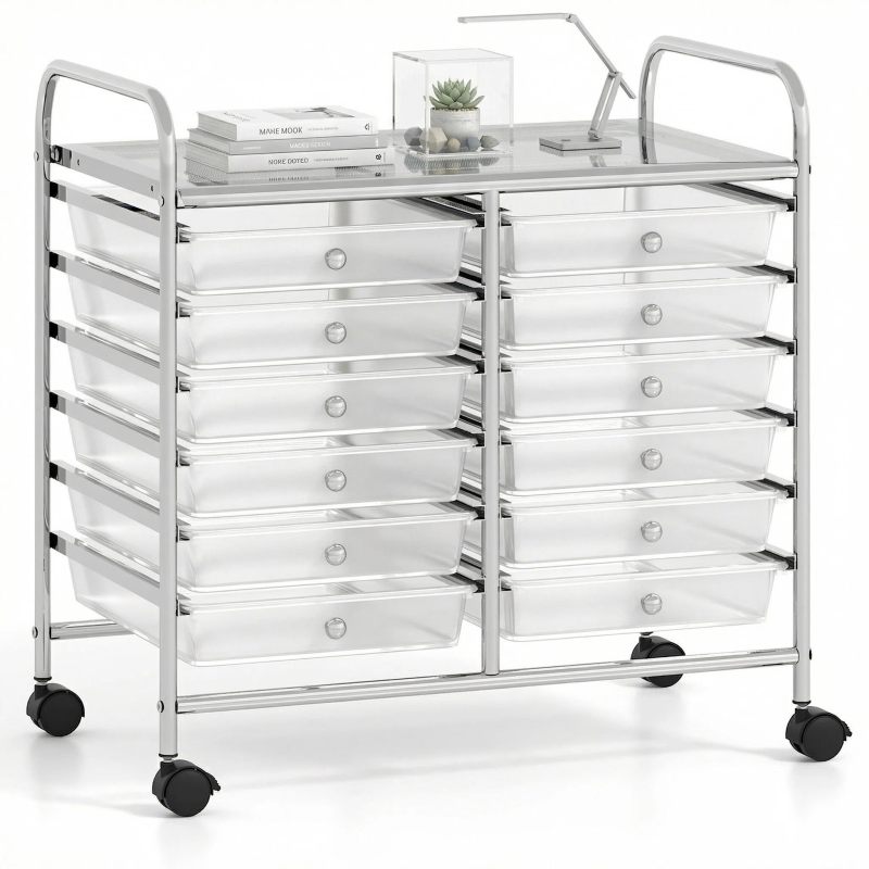This 12-drawer rolling storage cart will keep your room away from mess and bring convenience to your life! Equipped with a top open shelf and 12 removable drawers, this rolling cart boasts a large storage capacity to keep your supplies tidy and close at hand, such as cosmetics, arts and crafts supplies, tools, paper, decorations, etc. The round knob helps you to pull out the drawer easily. As for the quality, made of heavy duty steel frame and durable plastic drawers, this rolling storage cart ensures excellent stability and can be used for a long time. More importantly, featuring four 360° swivel wheels (2 lockable) and easy-to-grab side handles, this utility storage organizer cart can be moved from room to room with ease.