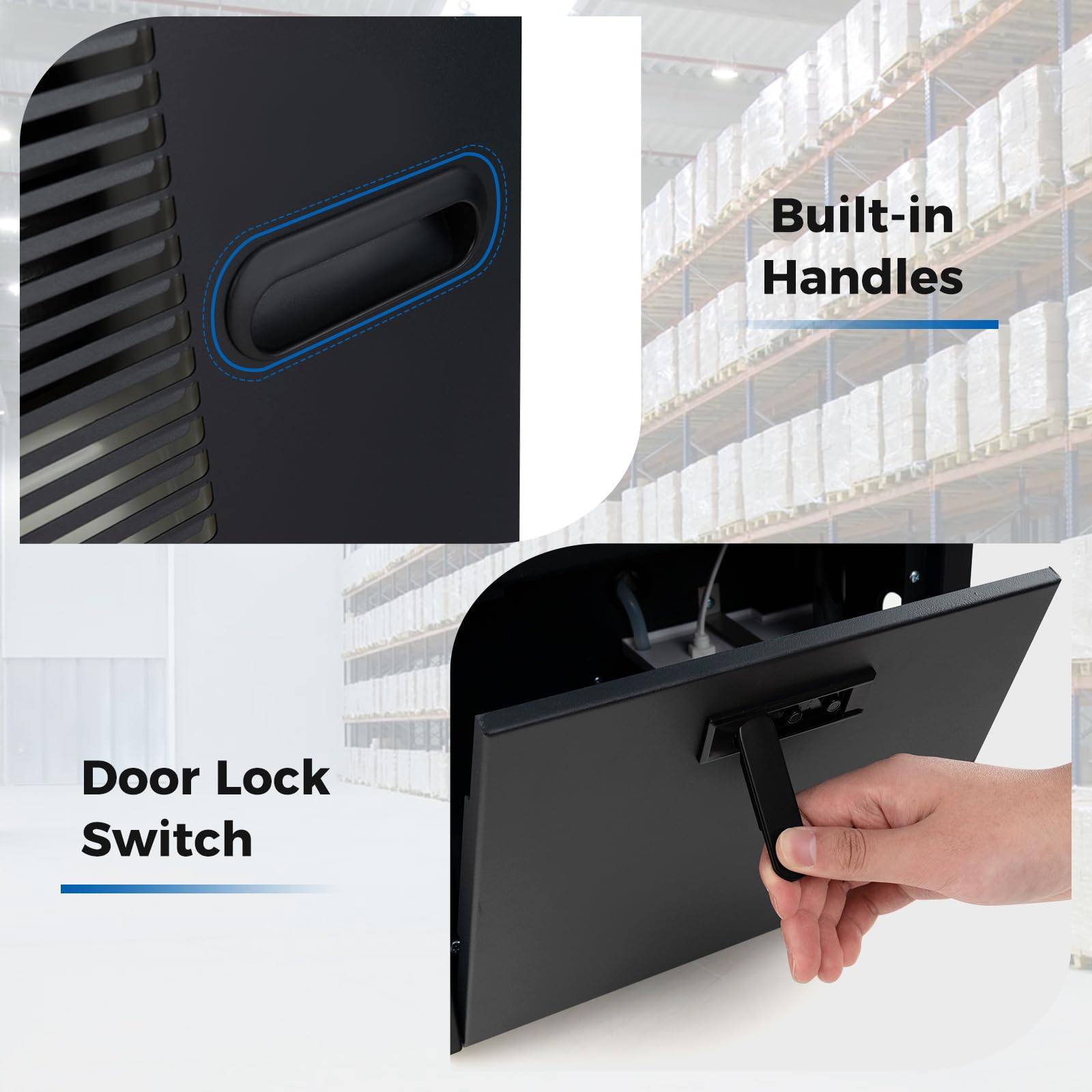 - [Dehumidify on the Go]: This portable dehumidifier with 2 built-in handles, a portable handle, 2 lockable universal wheels and 2 large 7.7-inche wheels for effortless movement from room to room, from job site to job site, and even from downstairs to upstairs.