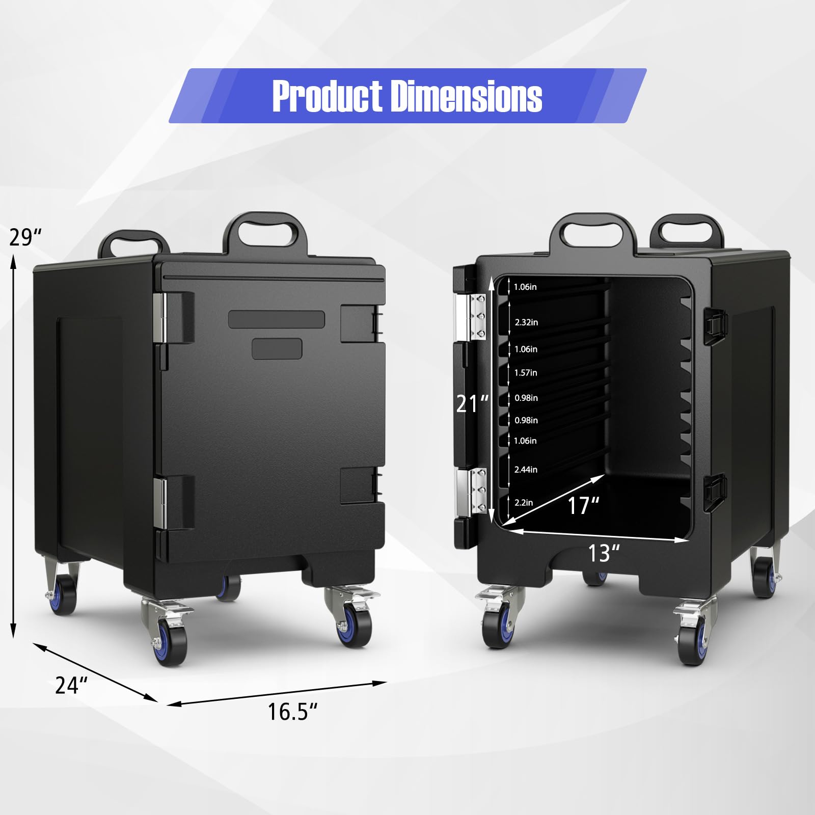 - Convenient to Carry and Use: The food warmer is equipped with 2 ergonomic handles, 2 universal wheels and 2 directional wheels with brakes, which is convenient and smooth to carry. The door can be opened 270 degrees to facilitate the removal of the dinner plate without being too narrow and causing the food to tilt.