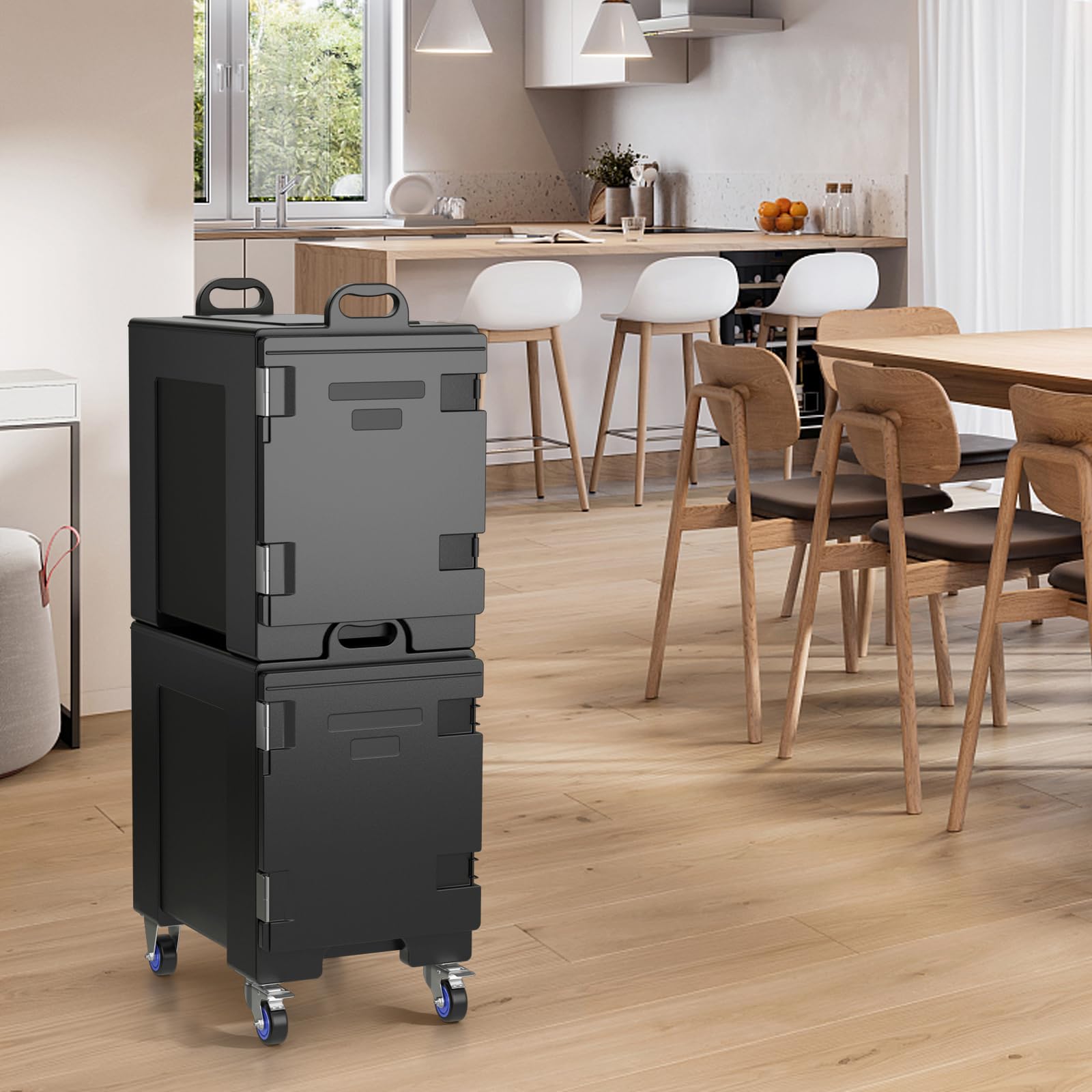 - Superior Non-Electrical Temp Retention - Featuring an insulated interior, this food pan carrier is made to keep hot or cold foods at a perfect temperature. Composed of LLDPE surface and PU foaming layer and embedded sealing ring, this front-load insulated food pan carrier features superior temp retention, maintaining the food inside warm for 4-6 hours or chilled for 4-6 hours with no electricity & energy consumed.