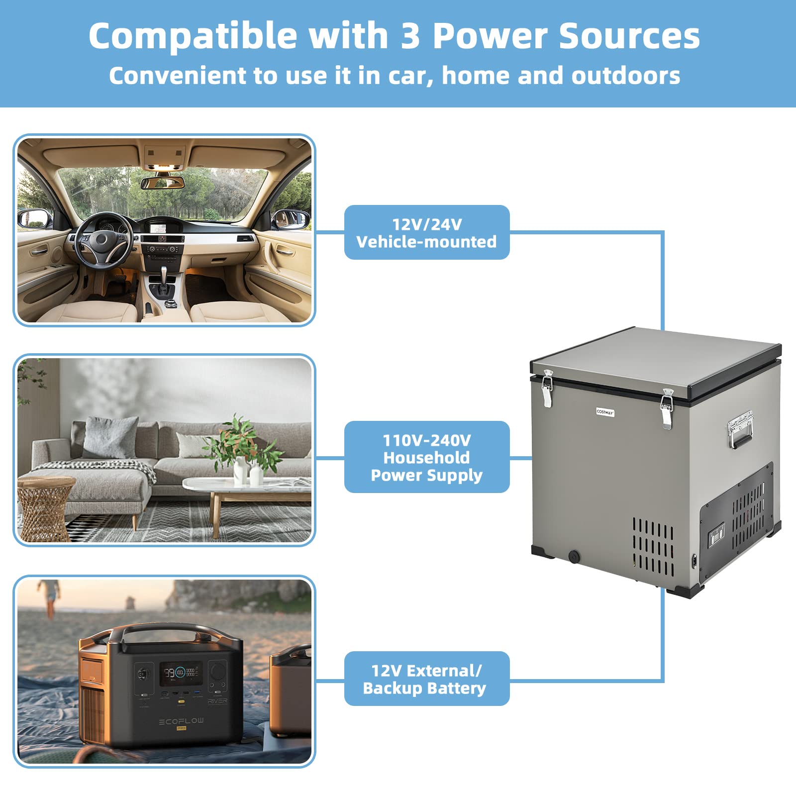 12V/24V car battery or 110-240V home outlet or 12V external/backup battery to activate the cooler