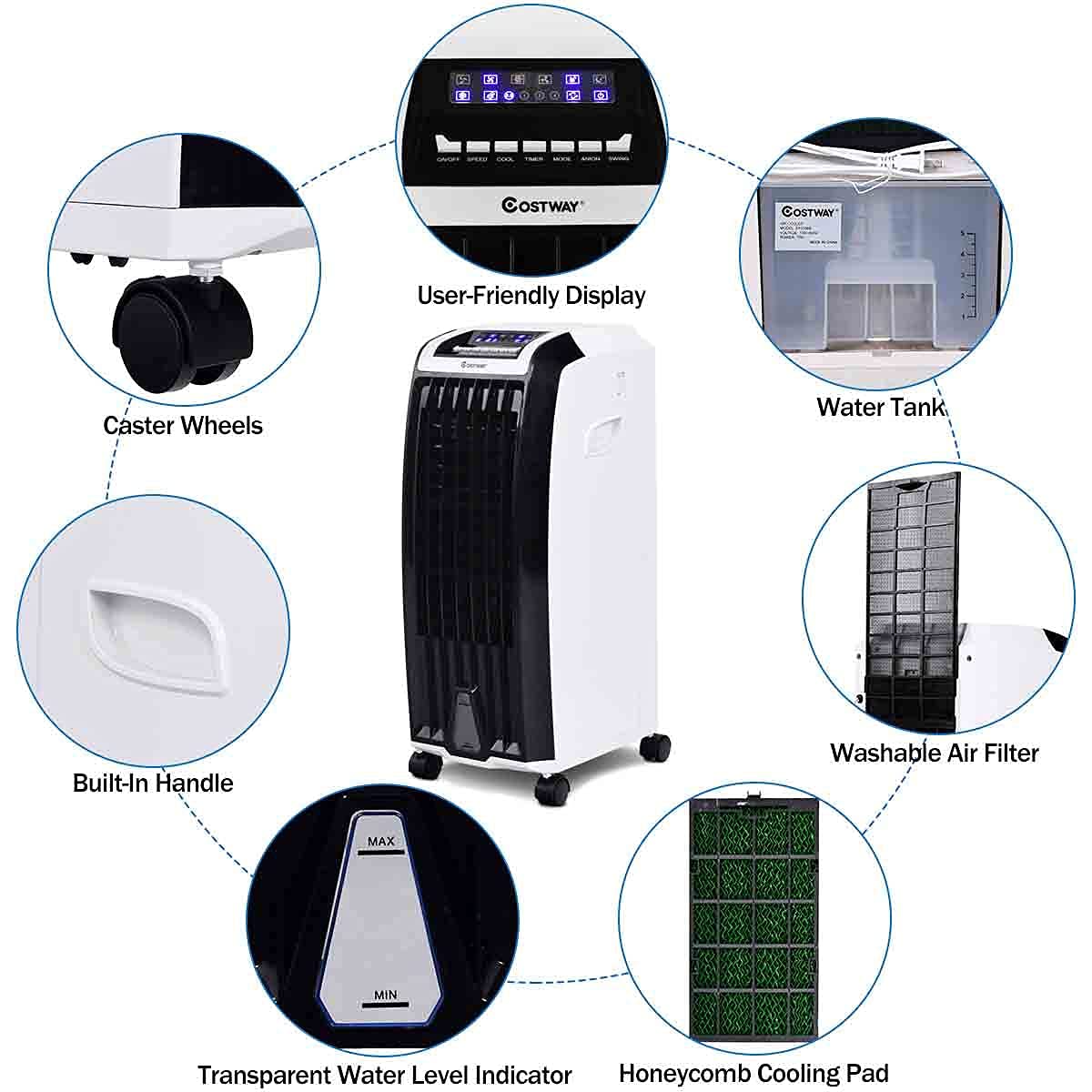 - đăHumanized DesignăThe evaporative air cooler with 6.5L large-capacity water tank allows for longer usage time to efficiently increase humidity and free you from frequent refills. Oscillation of the inner (up to 60°ďźand outer blade ďźup to 120°ďźto achieves wide-angle air supply in horizontal and vertical directions.