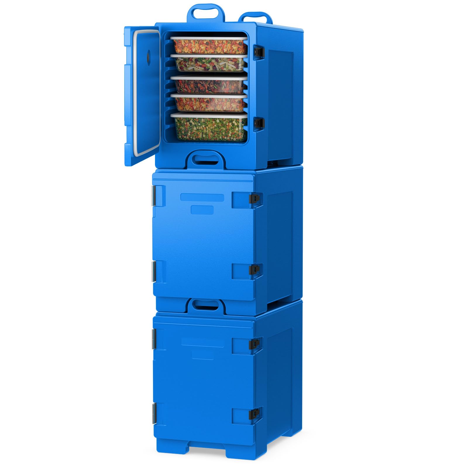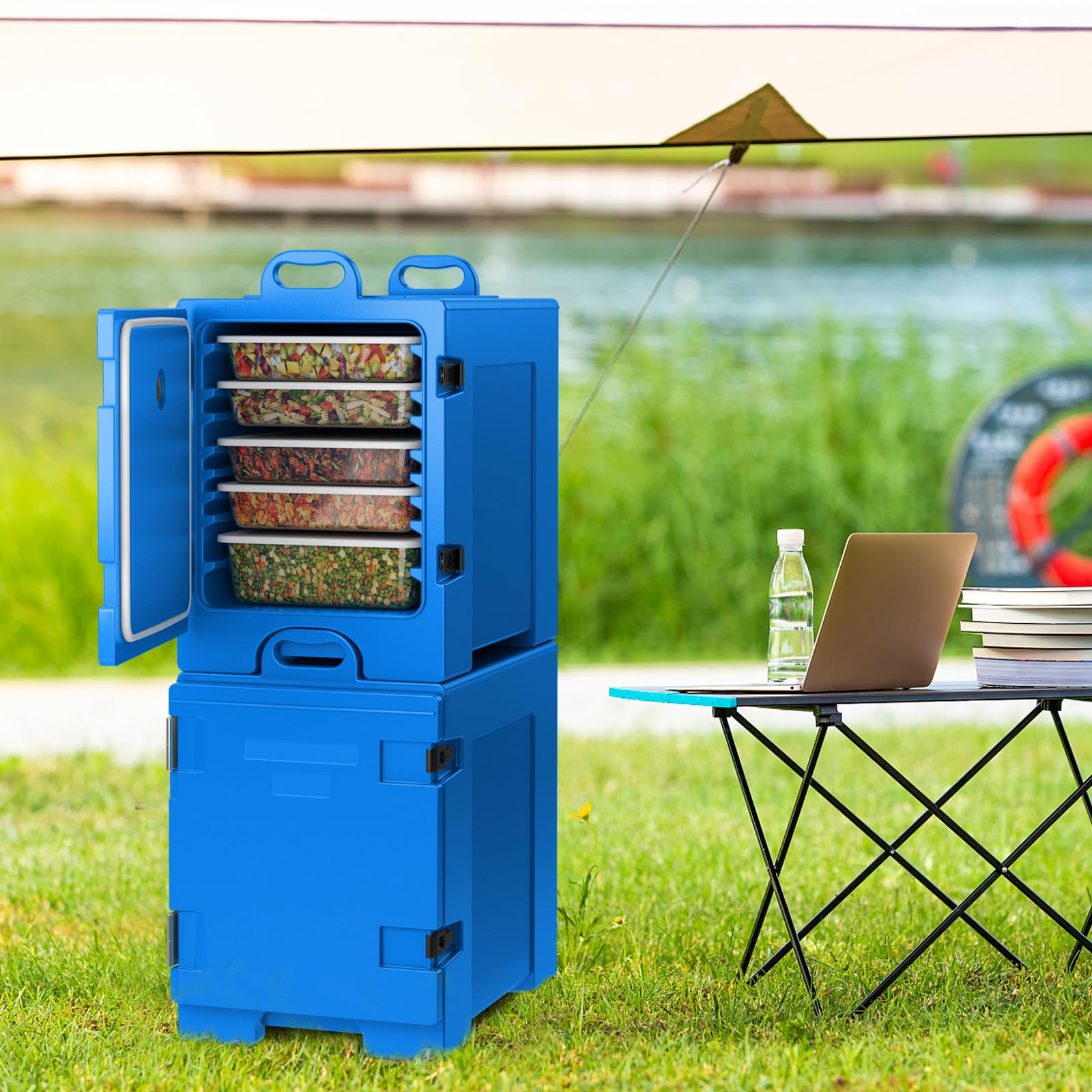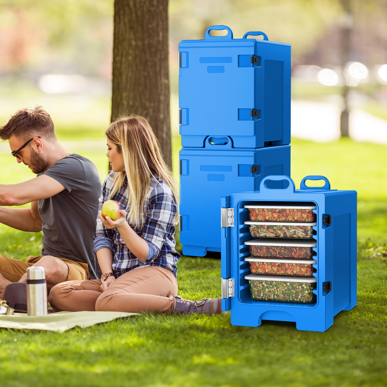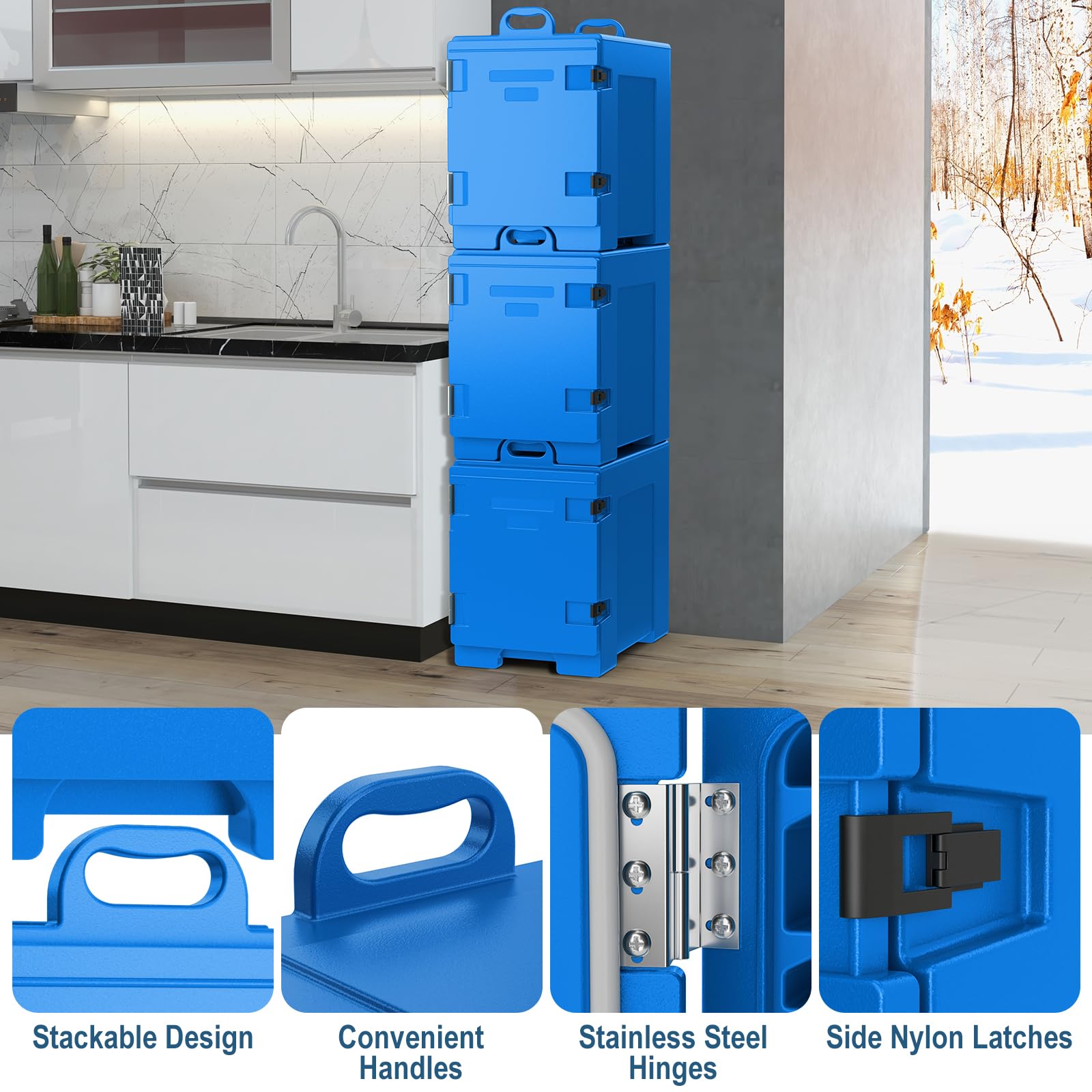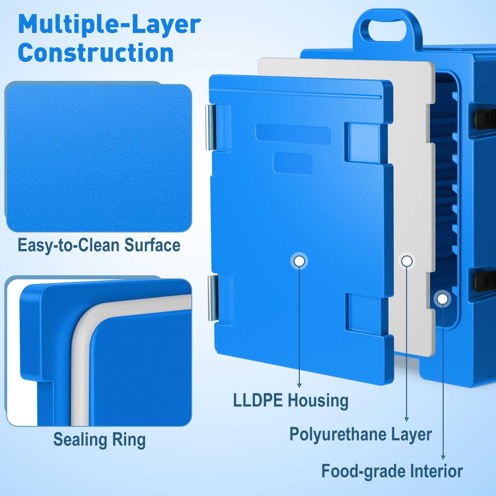 - 【Keep Food Warm up to 6 Hours】Featuring an insulated interior, this food pan carrier is made to keep hot or cold foods at a perfect temperature. Composed of LLDPE surface and PU foaming layer and embedded sealing ring, this front-load insulated food pan carrier features superior temp retention, maintaining the food inside warm for 4-6 hours or chilled for 3-5 hours with no electricity & energy consumed.