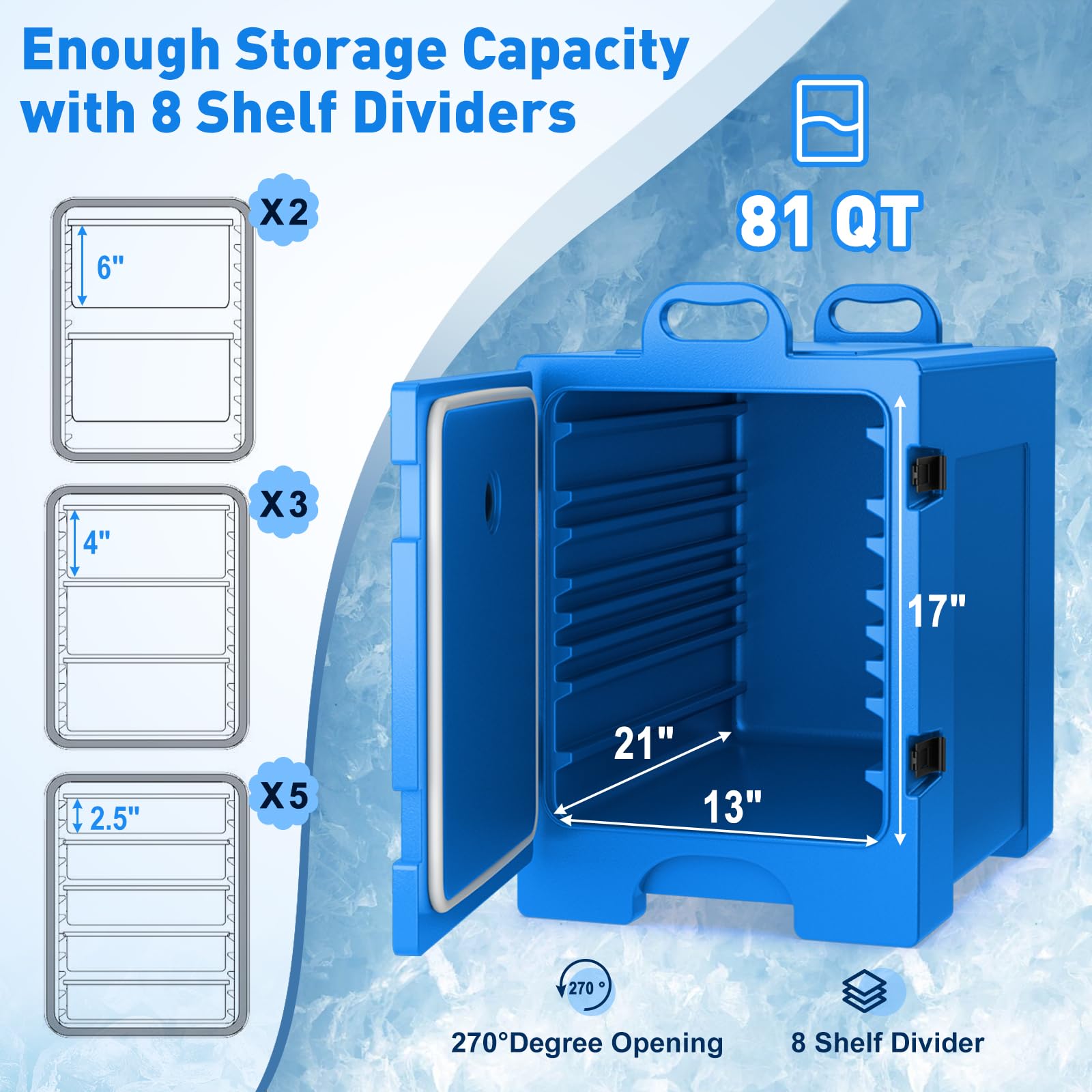 - 【Large 81 QT Inner Capacity】This hot box for catering can hold up to 5 full-size pans! With a spacious interior for holding a variety of pan sizes, this insulated pan carrier has a front-loading design for a convenient way to meet the demands of your menu, and you can transport large amounts of food all at once. Its internal dimension is 21"x 13"x 17"and the capacity reaches 81 Quarts / 77 L.