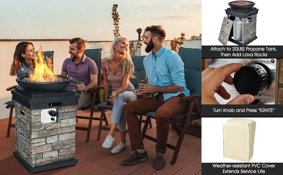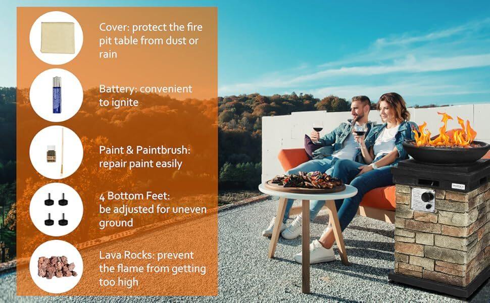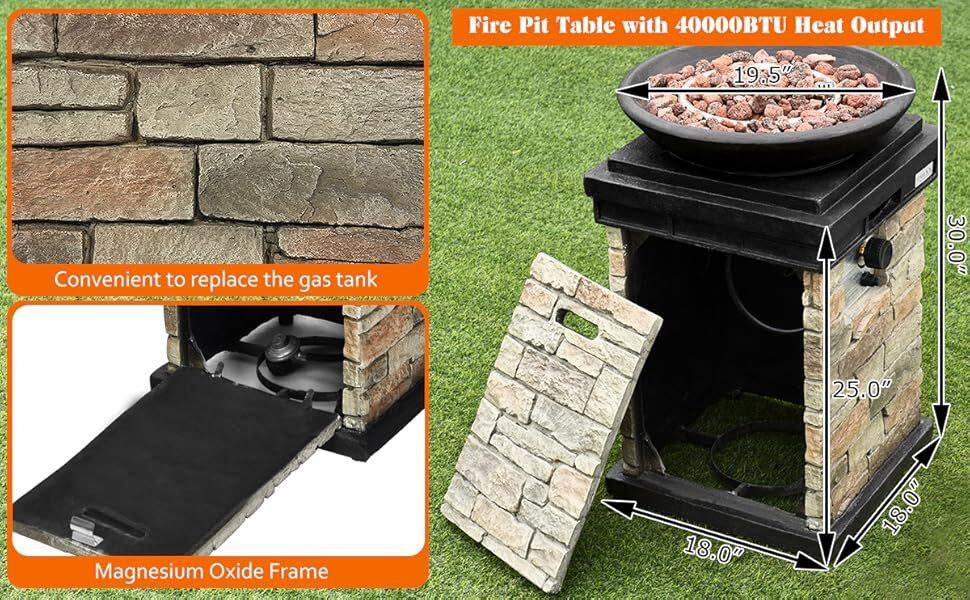 • 🏖️【Unique Craftsmanship & Design 】 The propane fire table with magnesium oxide on the top of the surface to protect from cracking and the stone look makes it more vivid and modern. The internal burner is made of stainless steel for a longer working and evenly heated.