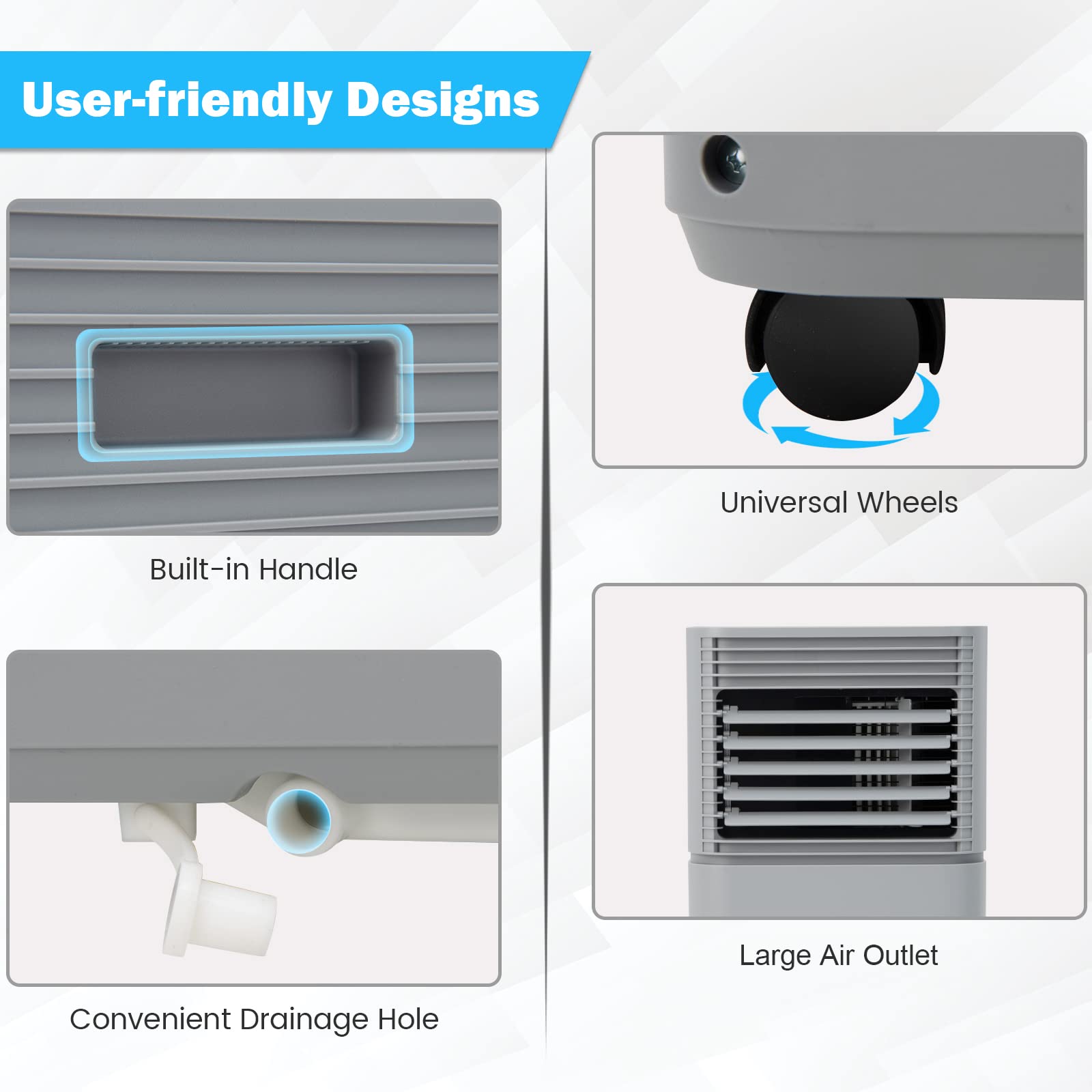 - Portable and Compact Size: The portable ac unit measures 31.5"x 31" x 69.5" and weighs only 45 lbs. Features handles and 360 ° universal wheels for quick moves from room to room, providing cool air when and where you need it. A plug storage hole on the back. All functions are designed in such a compact body providing much convenience to store it when summer leaves. Bring you awesome experiences without taking up too much space.