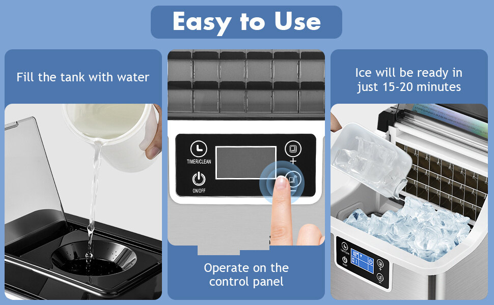• 🍋 【Smarter 24H Timer & Self-Cleaning】 - Press "CLEAN" button for more than 5 seconds to enter 20 minutes of thorough self-cleaning. Featuring a 24H timer, the self-cleaning ice maker can be set to stop before midnight and restart next morning by the timer function. When you wake up in the morning or get home from work in the evening, You can get a lot of ice from the ice machine immediately. A clear indicator on the LCD screen for ice full and water shortage remind.