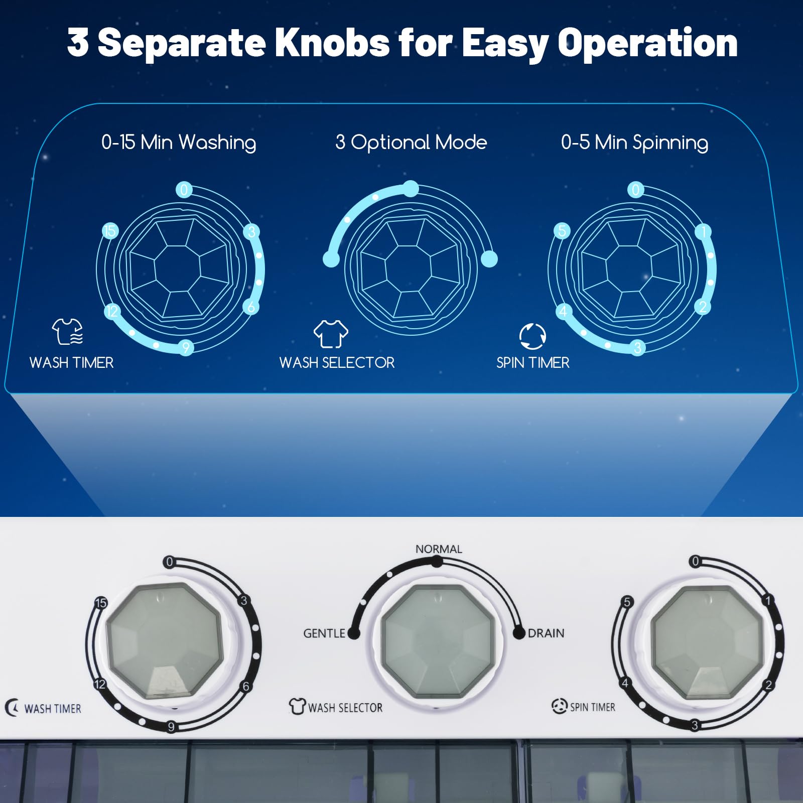 - 3 Separate Knobs for Easy Operation: There are 3 separate knobs for setting washing time, washing modes and spinning time, making operating the washer a real breeze. You can find the suggested time for different sorts of garment in the user manual.