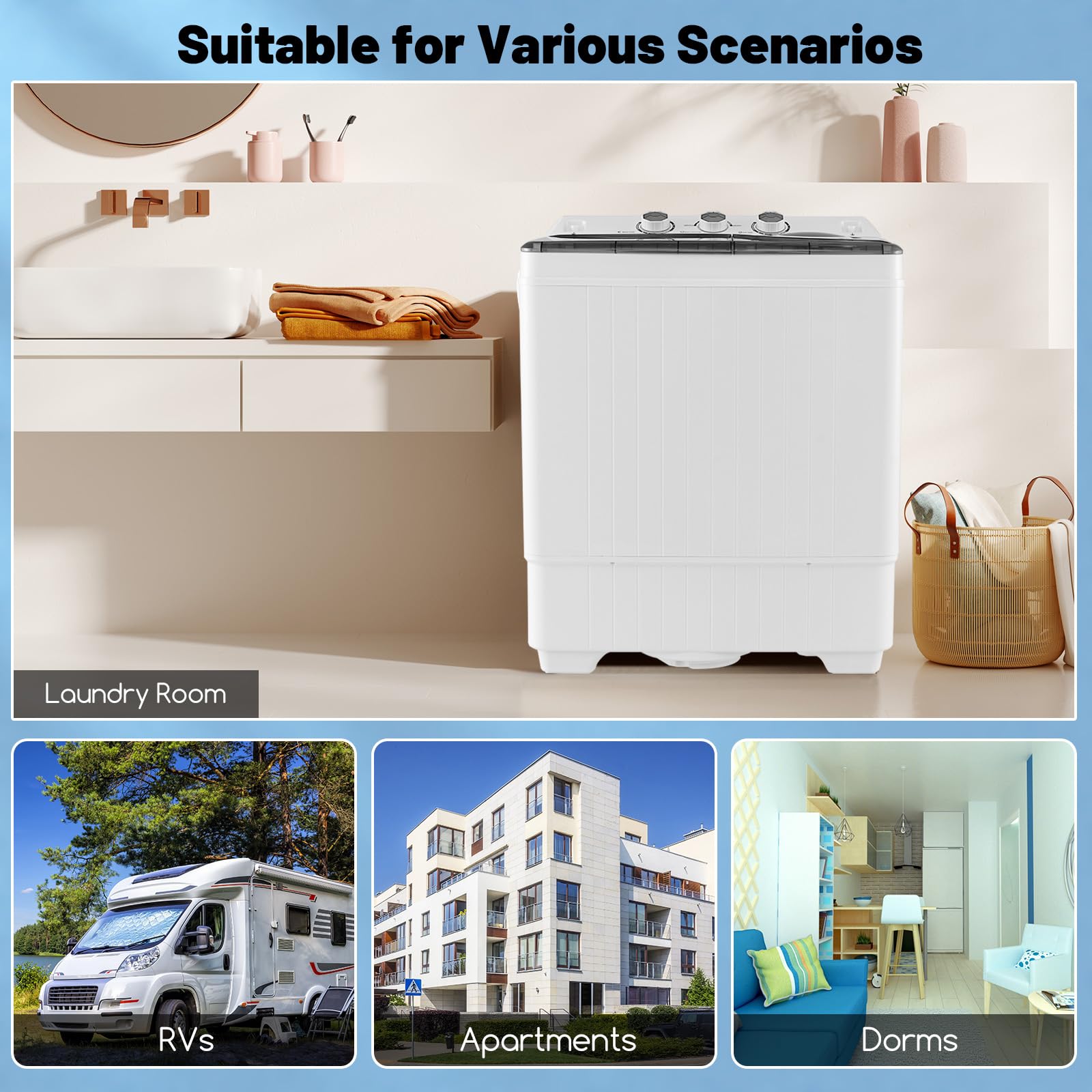 - Suitable for Various Scenarios: The washer and spinner combo has a compact and lightweight design, making it perfect for small spaces. Its versatile design also allows you to use it in various settings, such as dorms, RVs, and apartments.
