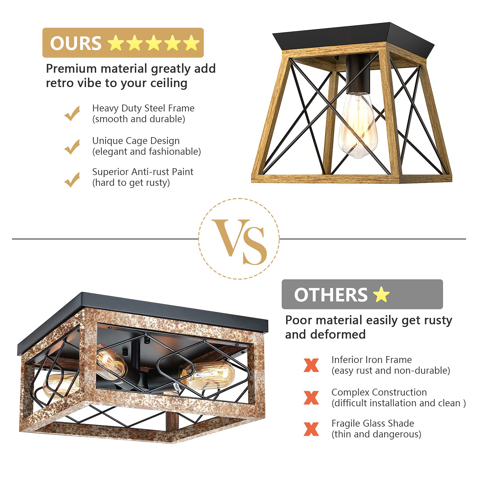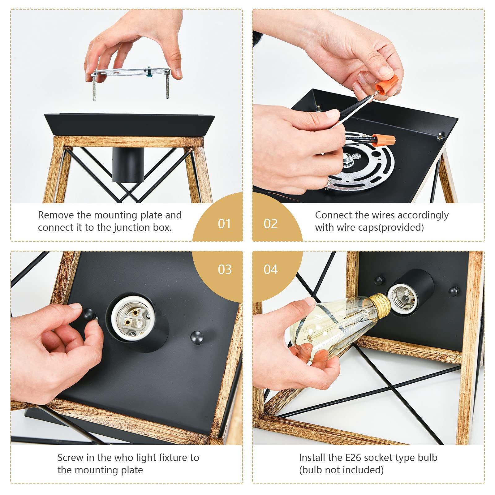- Quick Installation: The installation steps of the square ceiling light are simple, all you need to do is install the mounting bracket, wiring, securing the canopy and screw on the bulb. Beyond that, the open-caged design makes it easier to replace the bulb.