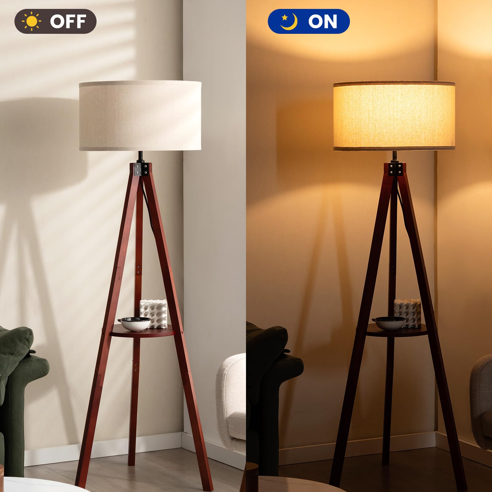 ARLIME Tripod Floor Lamp, Mid Century Wood Standing Lamp with Storage Shelves
