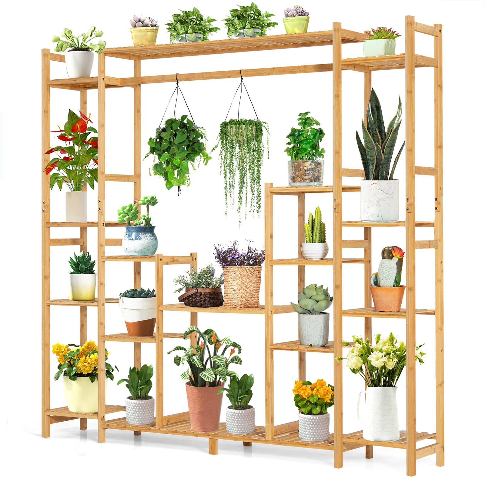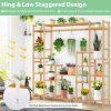 Bamboo Plant Stand with Hanging Rack & Anti-Dumping Device 2-In-1 High-Low Plant Holder Shelf