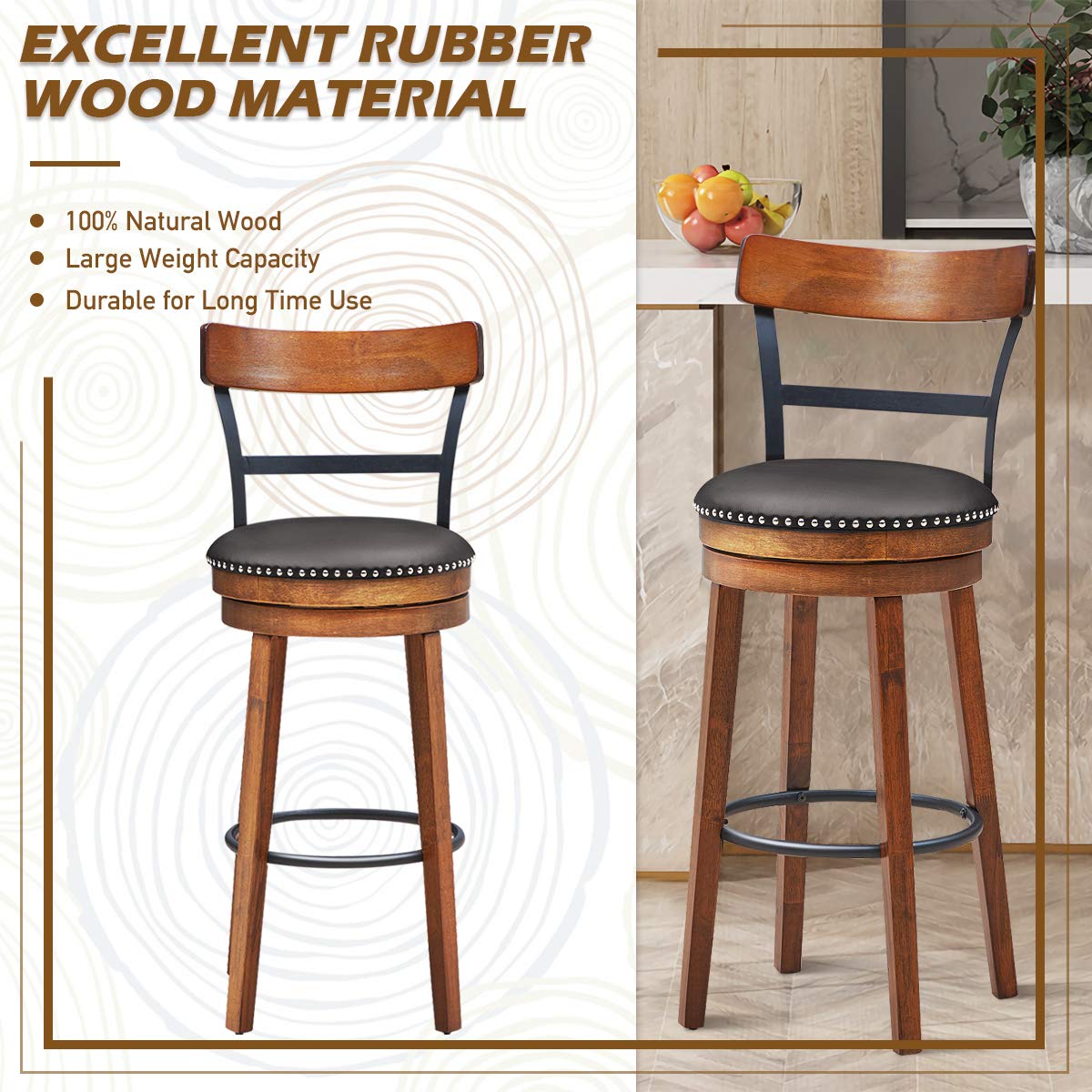Our rustic swivel bar stools will provide you with a comfortable place to sit while adding a touch of elegance to your room layout. Made of selected rubber wood, these bar stools are durable and sturdy. The four thick flared legs with a built-in foot ring provide strong support and ensure their stability. Featuring 360-degree swivel design, these bar stools give you the freedom of flexible movement, so you can communicate with others in any direction. Besides, PVC cushioned seat is comfortable to sit. You can put your legs on the footrest and enjoy leisure time. With its rustic appearance, our counter height bar stool is perfect for bistro, kitchen, coffee house, etc. Donβt hesitate to buy them!