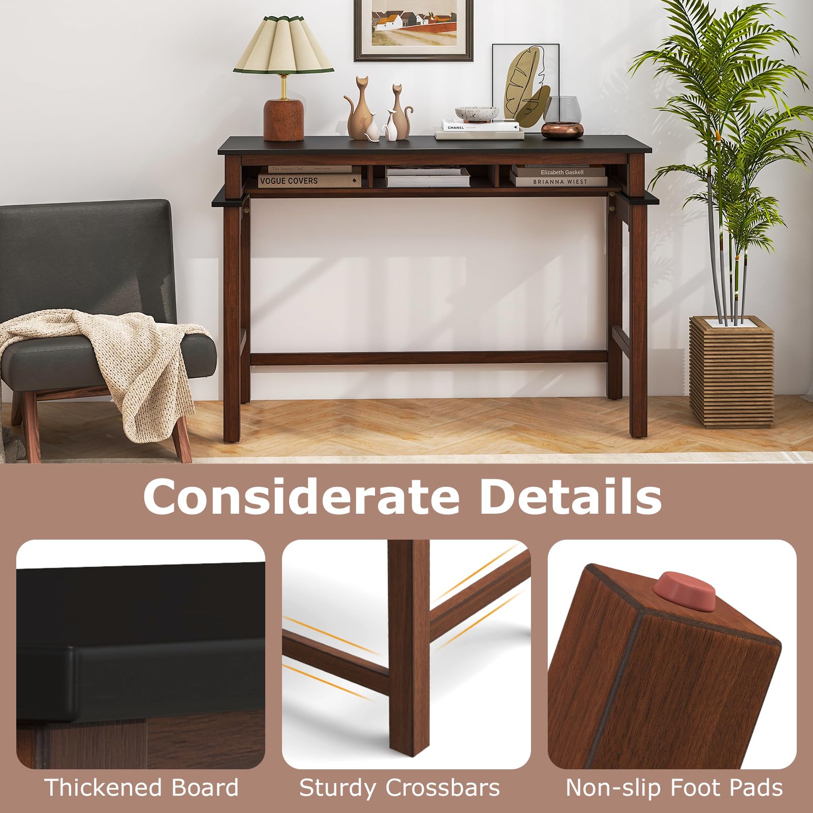 The integrated power outlet makes it easy to charge your devices while the cable hole ensures a clutter-free space. Featuring 3 storage compartments and wide tabletop, this bar table offers ample space to keep your belongings organized and within reach. Designed in a modern and farmhouse style, this console table combines functionality with a trendy aesthetic, adding a touch of sophistication to your home. Whether used as a serving area, work station, or display table, this counter height table is a reliable addition.