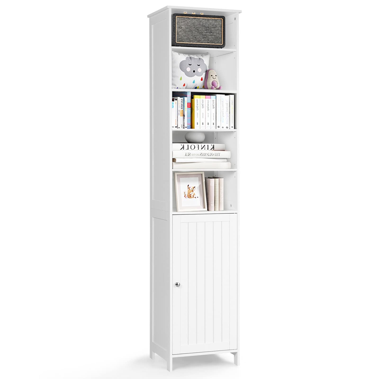 You can place this cabinet in your bathroom, bedroom, living room, kitchen, etc. 7 open and internal shelves with height-adjustable design enable you to put different things in order. 1 door with exquisite knob ensures easy opening, while the inside magnetic device ensures easy closing. Elevated legs prevent it from water stain and dust on the floor. Waterproof surface is super easy to clean. Besides, solid MDF frame ensures overall stability and sturdiness. Clear instruction helps you to assemble without effort.