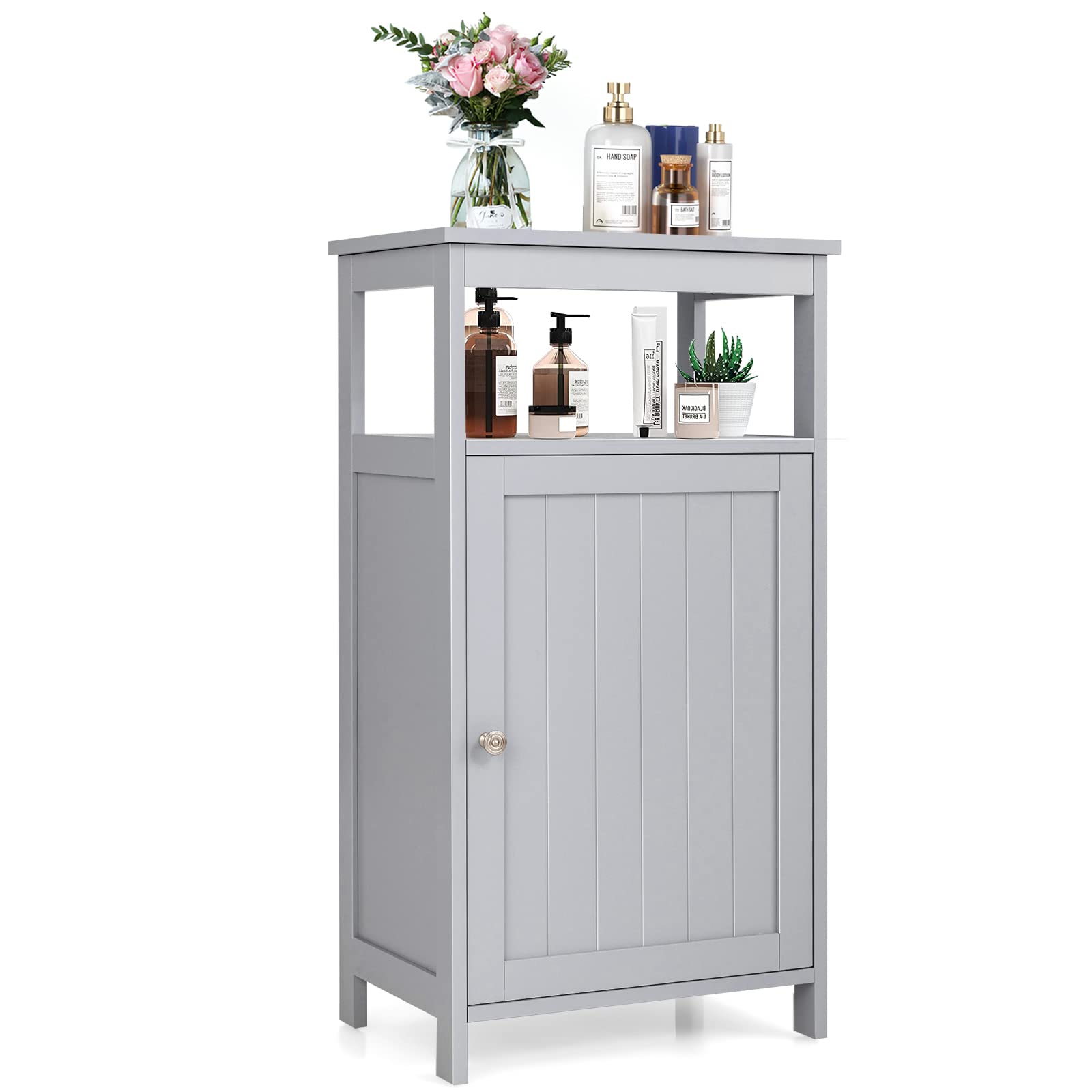 With simple color and elegant look, our floor cabinet is a perfect addition to your house. It can be used as a kitchen storage rack, sofa side table. Ample storage space (top, open shelf and storage cabinet) enables you to store towels, books, photo albums, plants and other items. Besides, the 3-level adjustable shelf behind the door can also meet your different storage needs. Moreover, solid MDF frame keeps it stable and sturdy. Anti-tipping design and non-slip foot pads allow for extra security and higher sturdiness. Furthermore, it's easy to assemble. Round knob and magnetic door stopper help you to easily open and close the door. Raised legs protect the cabinet from water.