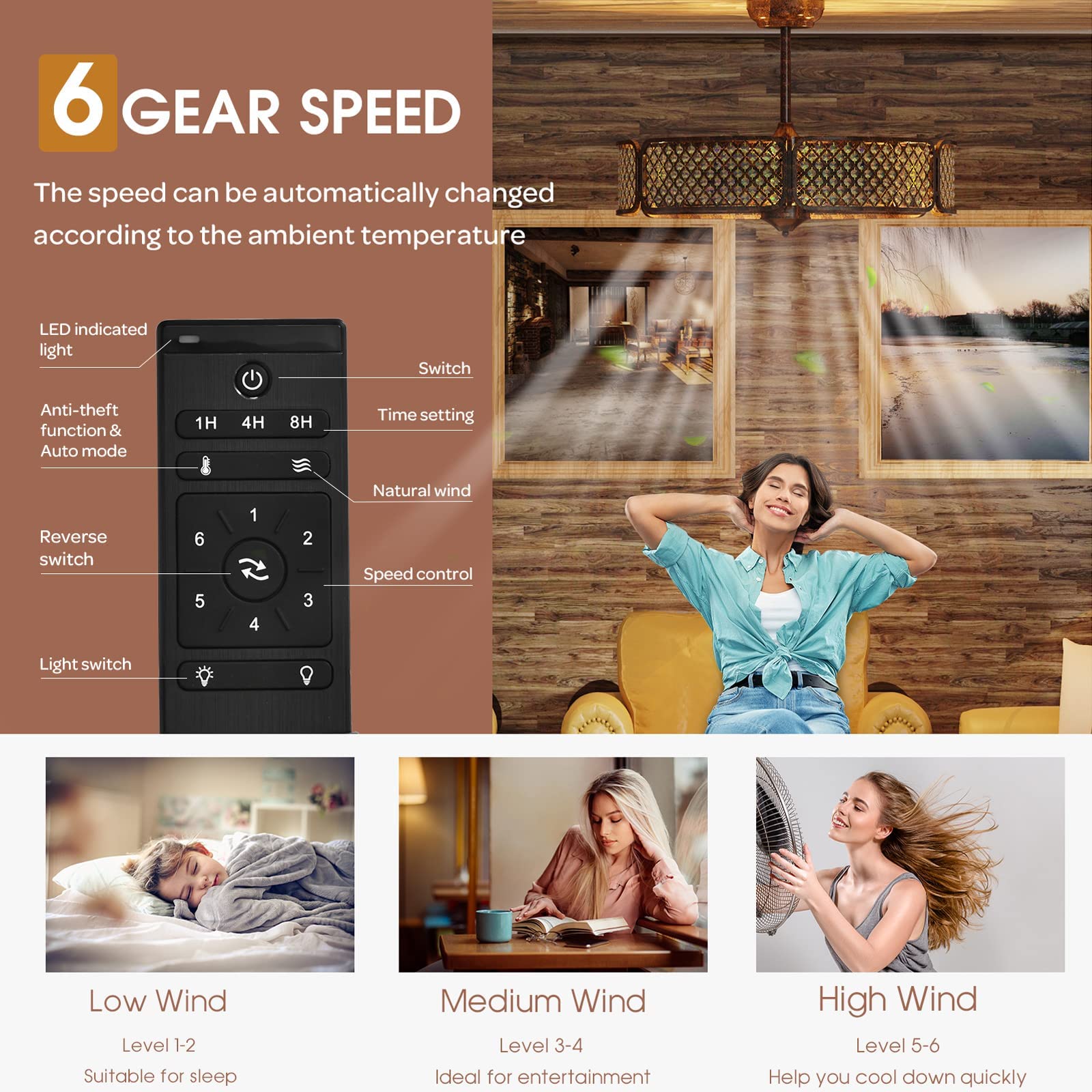 - 【6 Adjustable Fan Speeds】The fan speed can be adjusted into 6 levels from low to high based on your demands. And the auto mode with heat sensing system enables the ceiling fan to change the speed automatically according to the ambient temperature. All of these settings can be operated on the remote control.