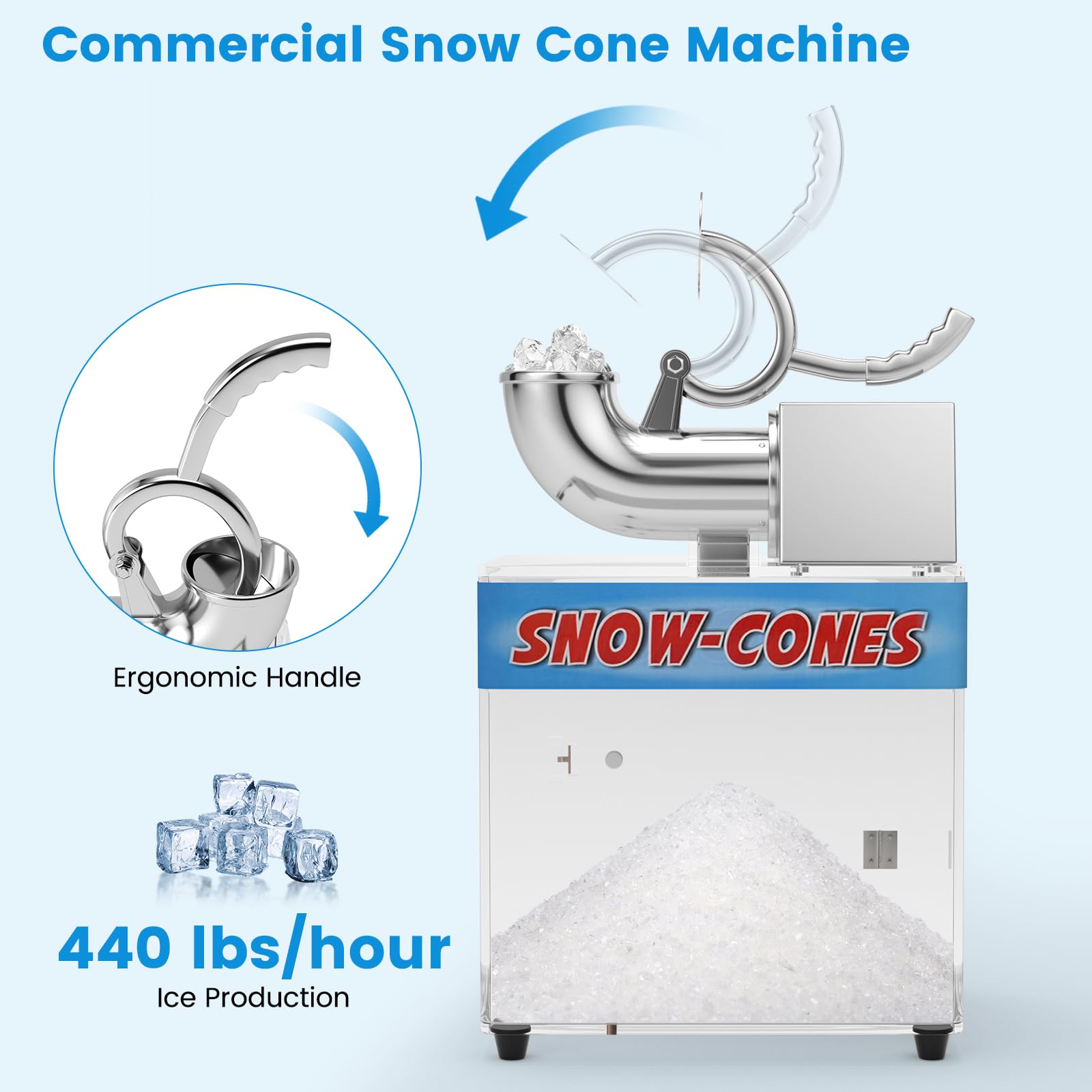 - π§ [440 LBS/Hour Ice Production] This high-efficiency snow cone machine can produce up to 440 lbs of shaved ice in a relatively short time and help to meet your urgent demands of a large passenger flow. It is suitable for home and commercial use, such as restaurants, bars, food trucks and more.
