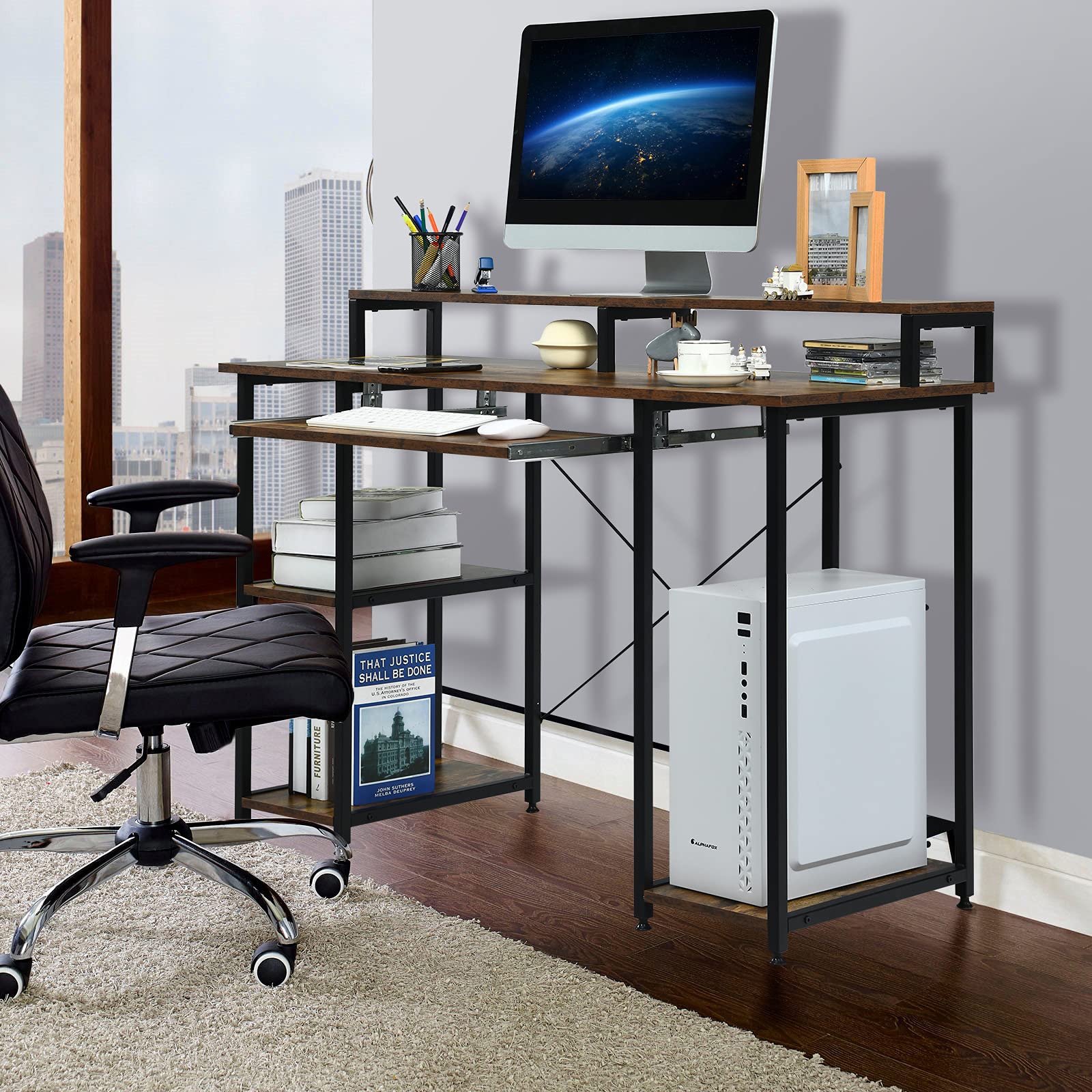 Are you looking for a compact computer desk with ample storage space? Our PC desk with hutch is just the one you need. The monitor stand, keyboard tray and open shelves on both sides under tabletop offers plenty of storage space for you. And the premium engineered wood and steel frame ensure sturdiness and durability in a long time. In addition to that, the rustic style could fit with kinds of decorations. It is perfect for farmhouse, apartment, home office and great to put in the living room, study or bedroom. Just get one and you would find it value for money.