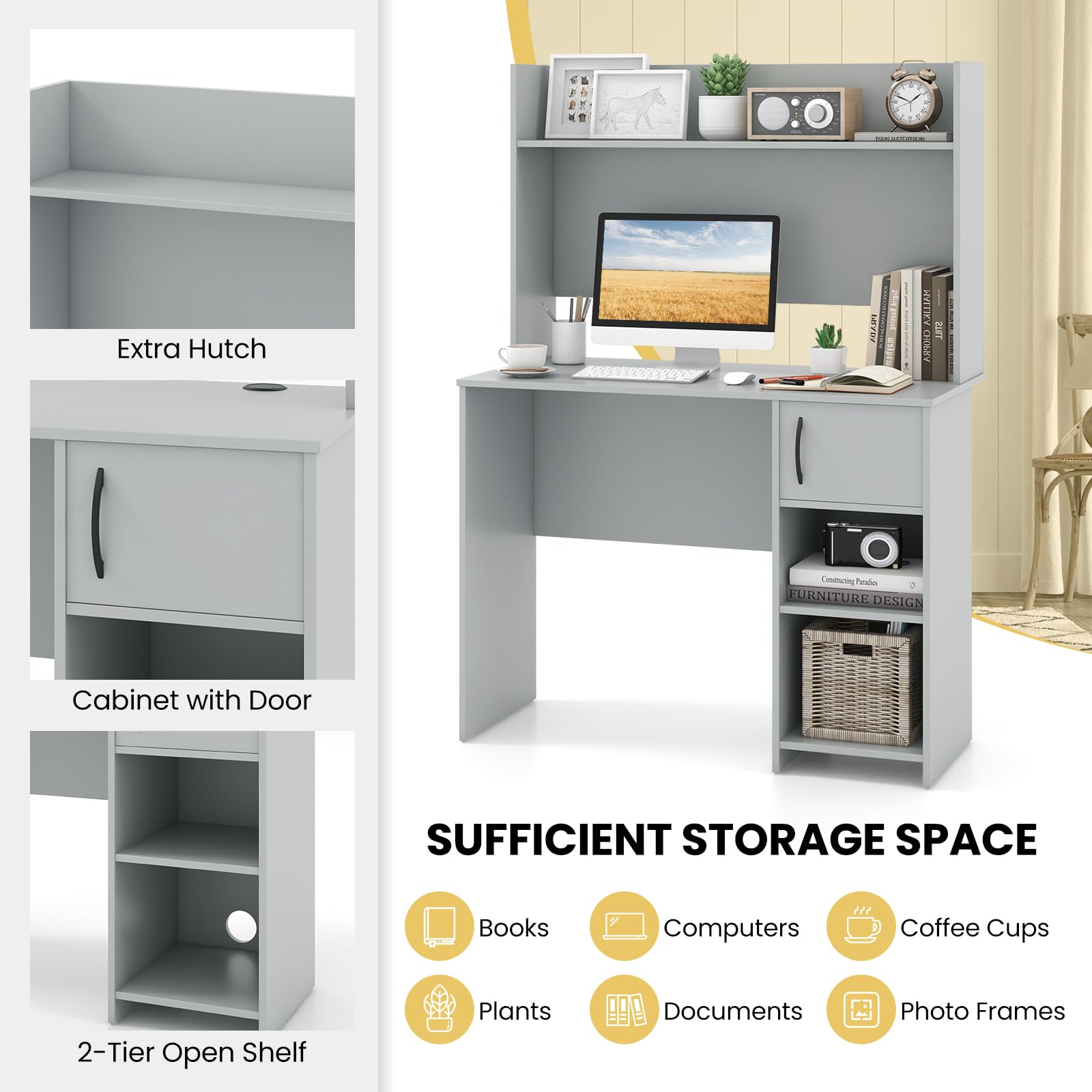 Ample storage space with extra hutch, cabinet and 2-tier open shelf