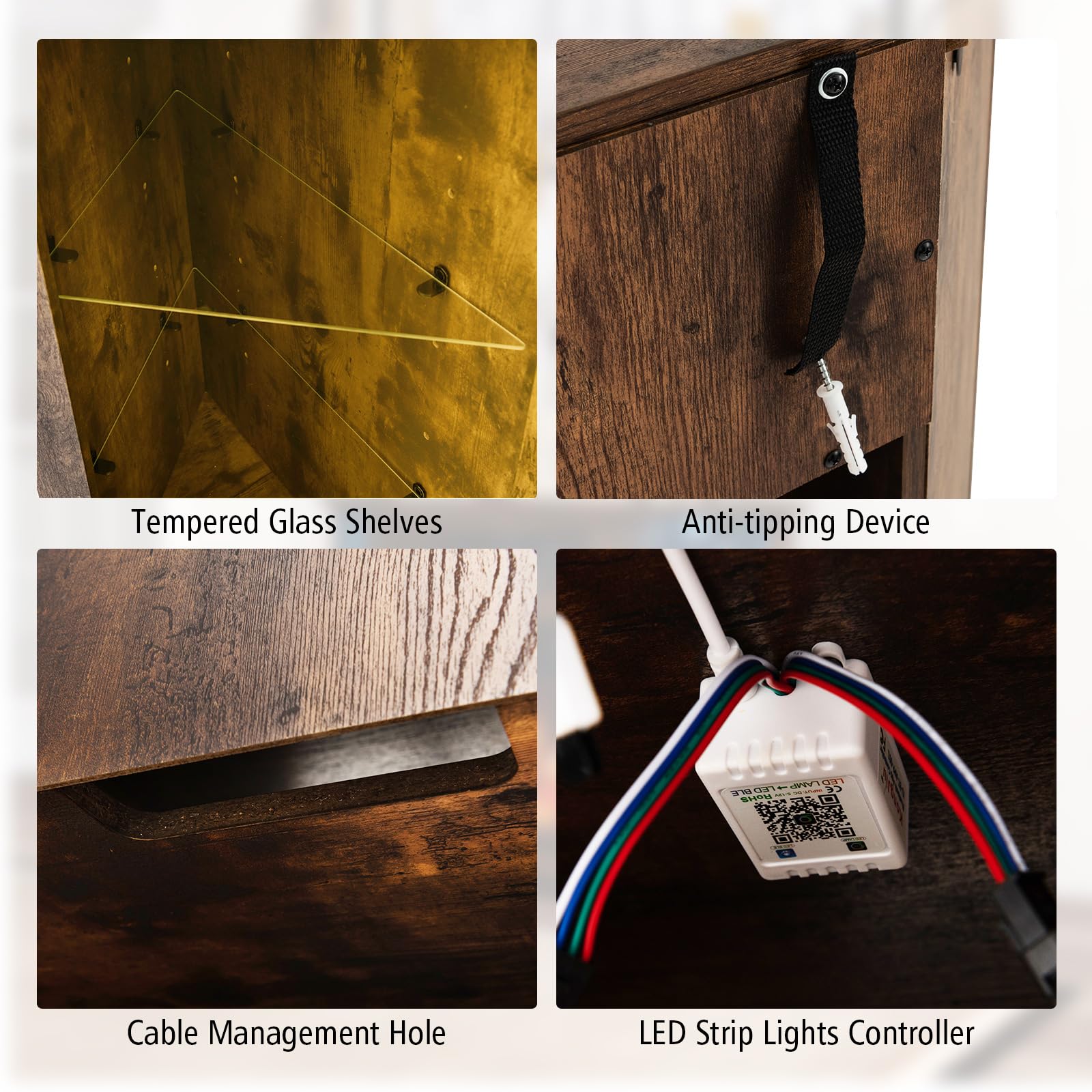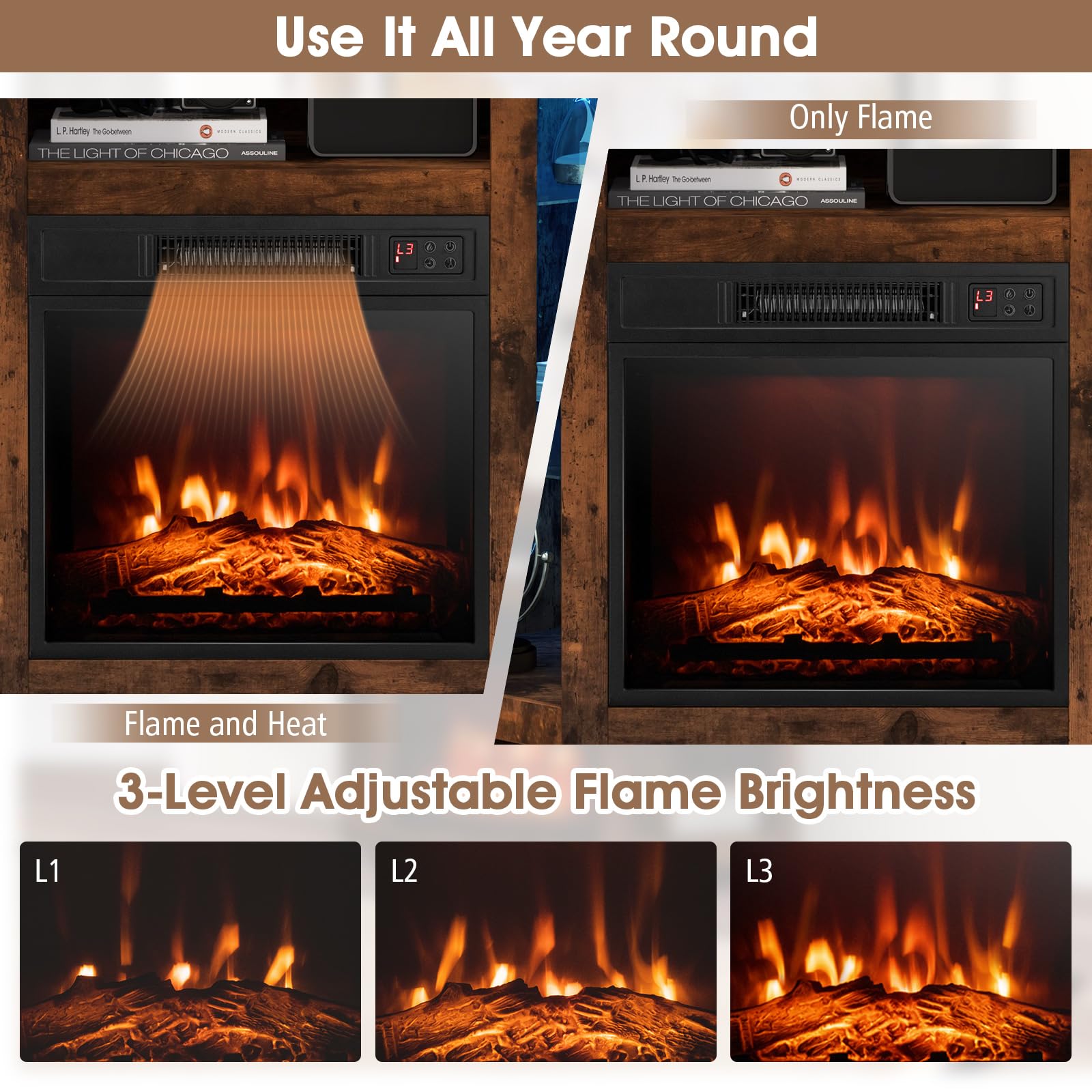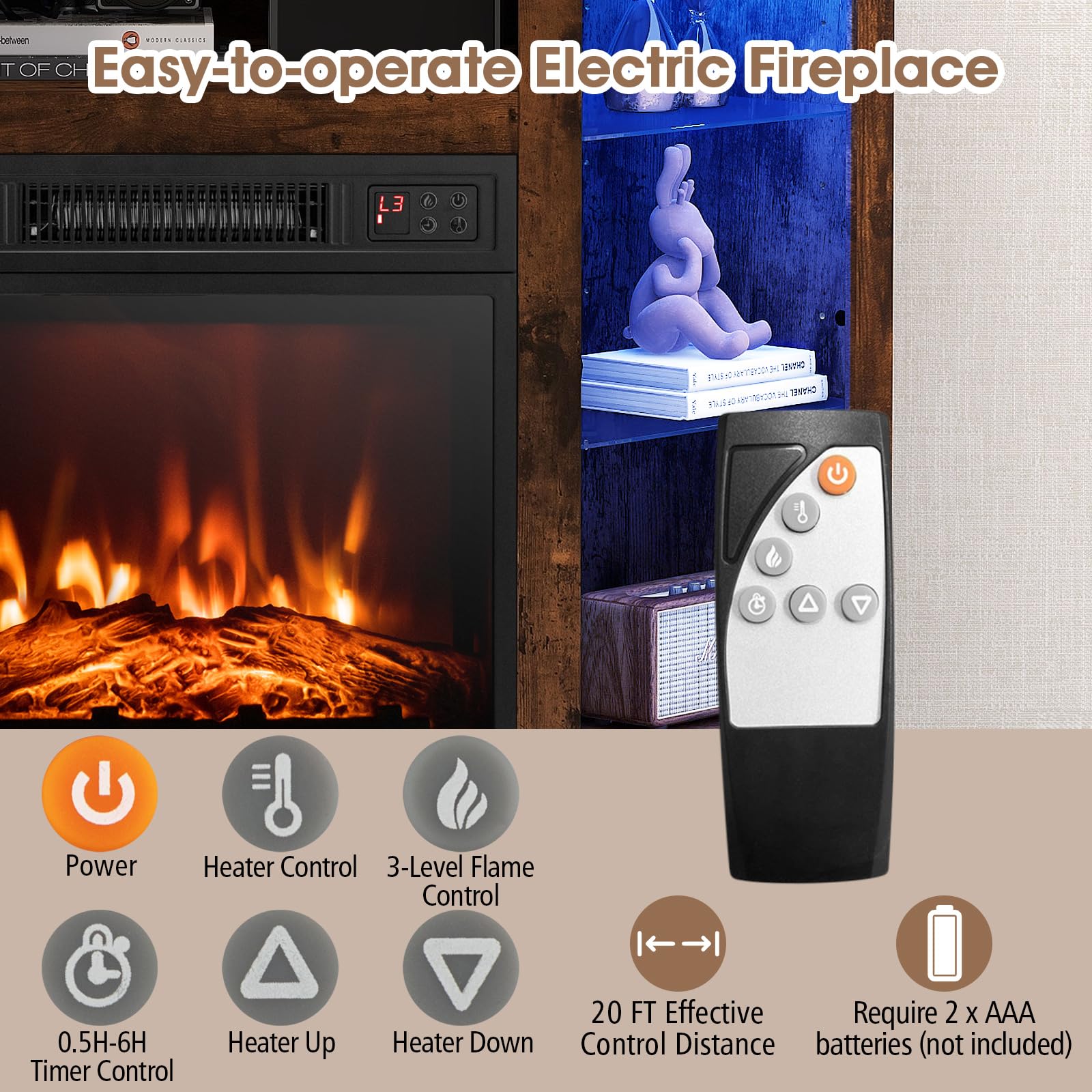 This corner fireplace TV stand is a stylish and functional addition to any living room or entertainment space. With its modern design, it adds a touch of elegance to your home decor. The built-in electric fireplace creates a warm and inviting atmosphere with its realistic flame effect. Both sides of the stand also feature 16-color LED lights, allowing you to customize the lighting to suit your mood. The electric fireplace is easy to operate via remote control or touch panel, with specific functions including heater control, 3-level flame control, 0.5H-6H timer control, heater up and heater down. While providing efficient heating, it also features overheat protection, so you don't have to worry about safety. In addition, a large countertop, an open compartment and 3 tiers of tempered glass shelves provide ample storage space, perfect for media devices and accessories. This corner TV stand is a space-saving solution, making it ideal for your living room or bedroom. Enhance your entertainment experience with this versatile and stylish TV stand.