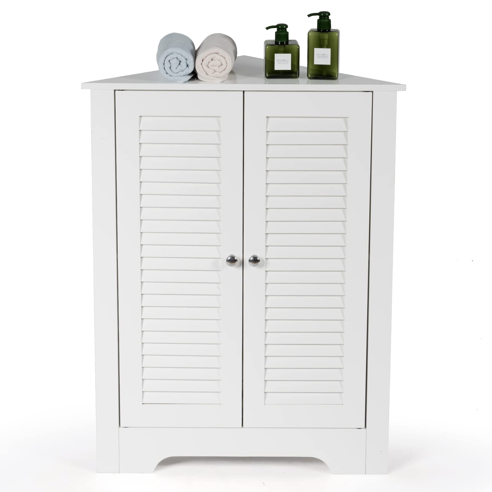 • [Large Capacity with Adjustable Shelf]The 2-door storage cabinet can meet you needs and keep the room tidy.In addition to the spacious triangular tabletop, the storage organizer also features 2 tiers of shelves behind the doors.More importantly, the middle shelf can be adjusted to 3 heights or be removed to customized an ideal storage space.