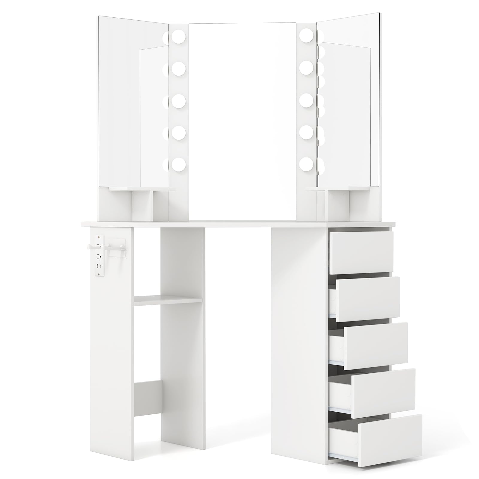 Transform that awkward corner into a highly functional and stylish beauty hub! This modern corner vanity desk is expertly designed to save valuable floor space while providing everything you need for effortless organization and flawless preparation.
