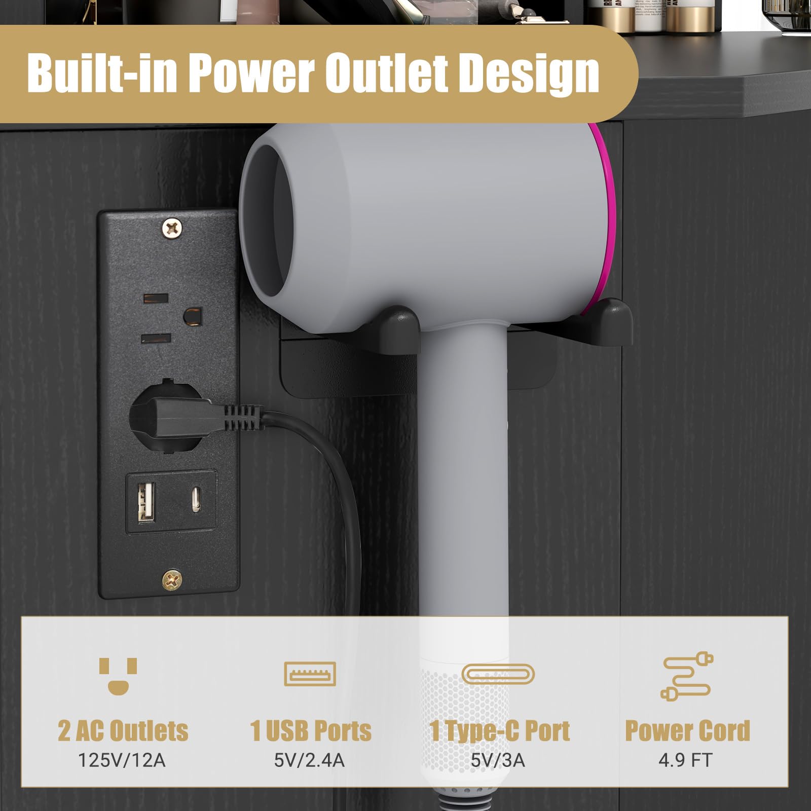 Convenient built-in stand securely holds your hairdryer, keeping it accessible and freeing up drawer space