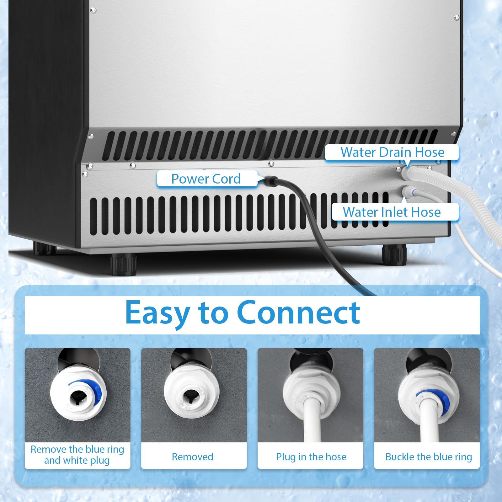 It comes with everything you need to get started: a scoop, connection hose, drain and inlet hoses, so installation was a breeze. Whether youre using it under the counter or as a freestanding unit, it fits seamlessly into the space. The ice it produces is clear, solid, and perfect for drinks or food service.