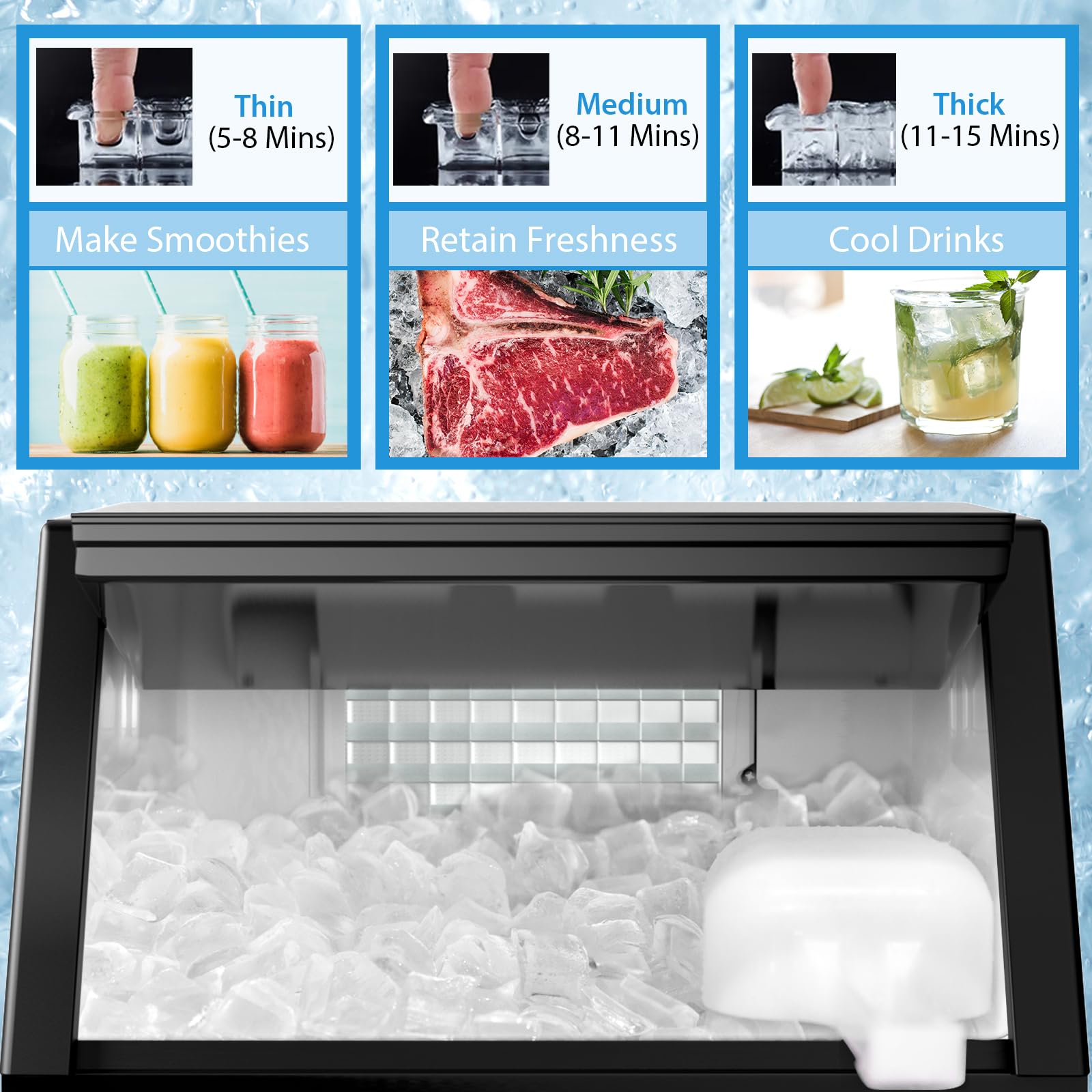 - π§ [Simple Operation] By pressing the TIMER CLEAN button for 5s, this freestanding ice maker will activate the self-cleaning function for great convenience. Additionally, you will get thin, medium or thick ice cubes by pressing the β+β or β-β button. And the βADD WATERβ and βICE FULLβ indicators will light up to alert you.