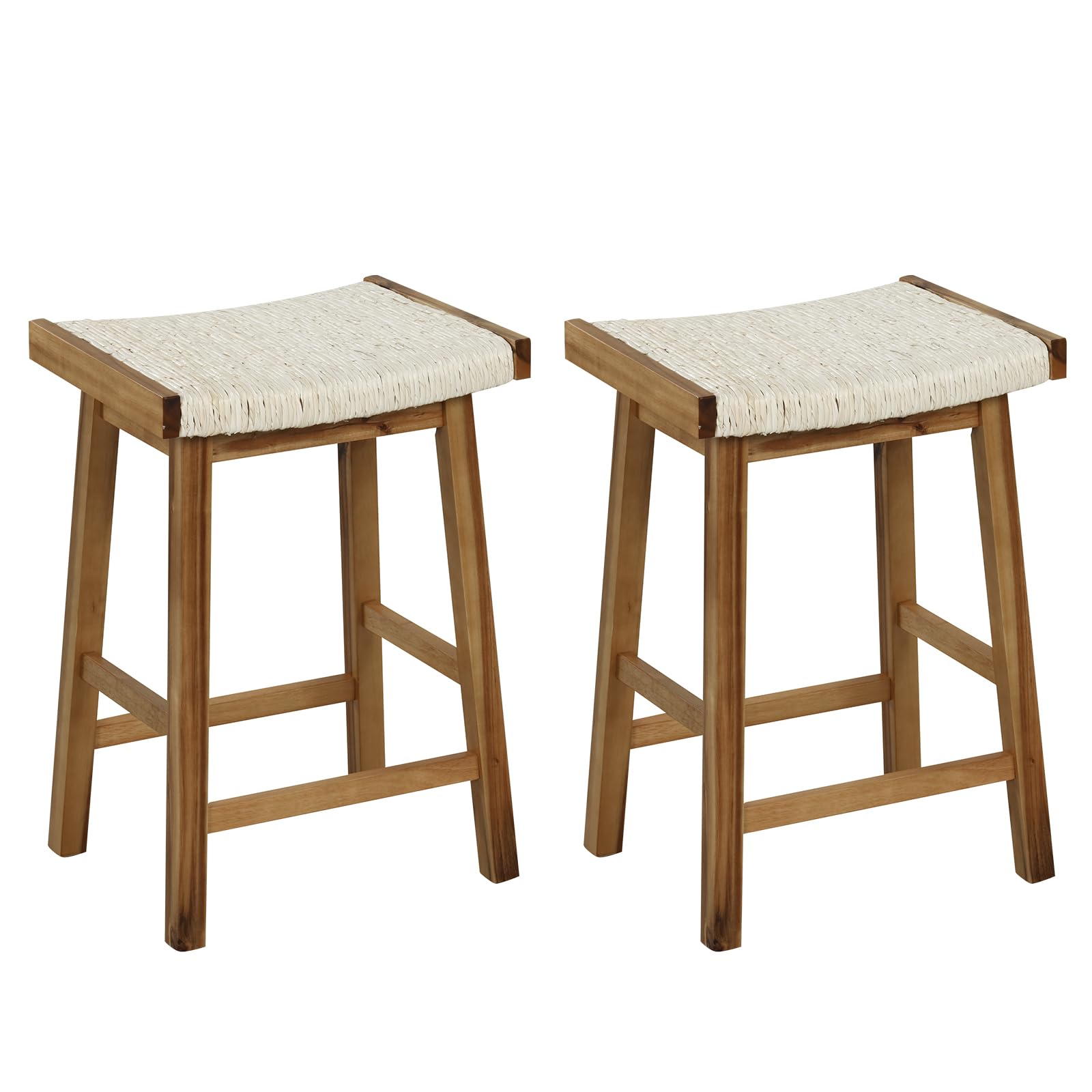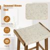 Bring style and sophistication to your space with this saddle stool set. Each backless barstool features a seaweed woven seat that provides unique aesthetics and optimal comfort. The unique seaweed woven design ensures easy integration with any decor style. Its height is perfect for most common kitchen counters or islands, and the convenient footrests allow you to relax your feet, providing a comfy seating experience. Constructed with durable materials, including a sturdy wooden frame, these stools offer stability and support for everyday use. The versatile design makes these stools applicable to various occasions, such as kitchen counters, home bars, or coffee shops.