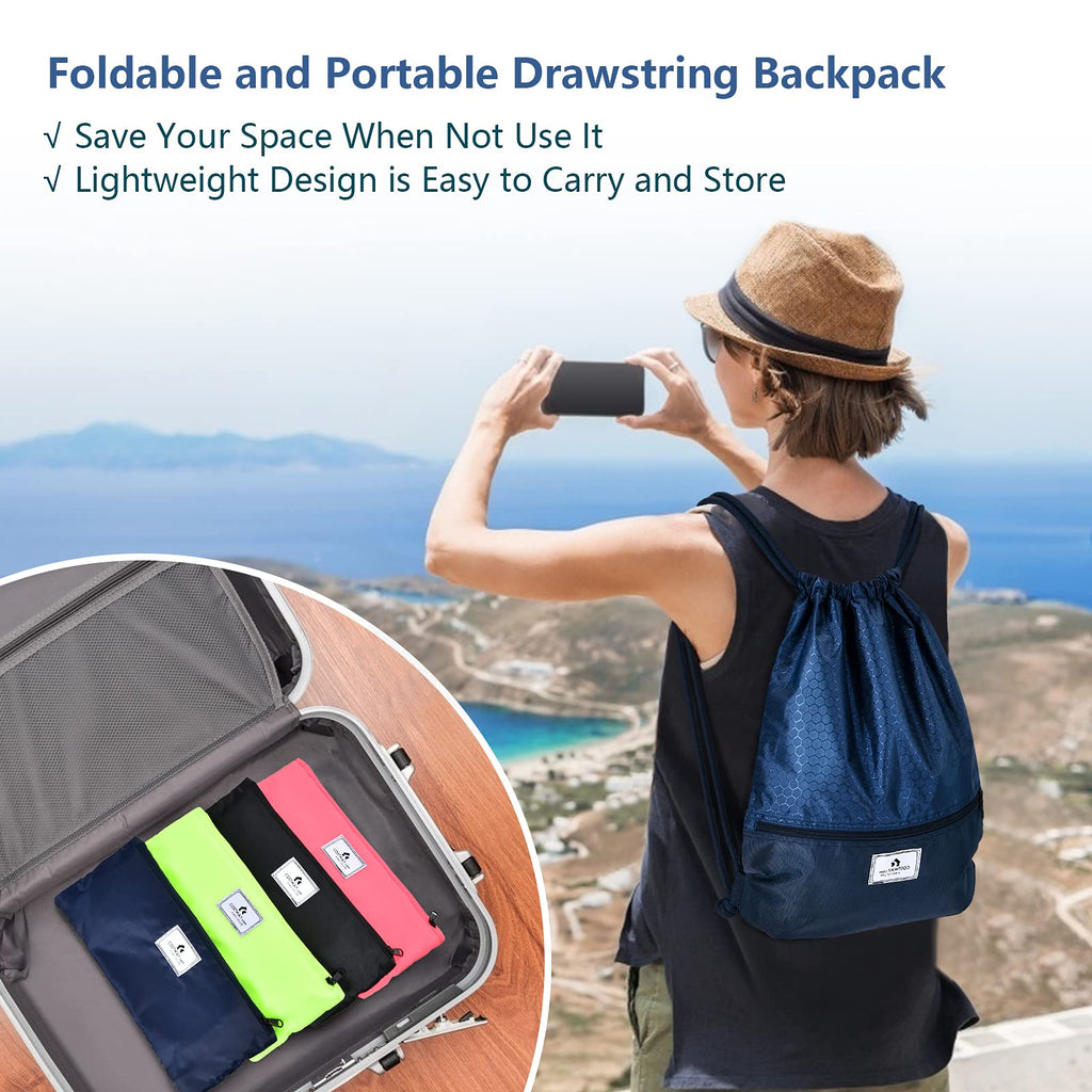 With upgraded shoulder straps, this string bag brings comfort while using it. Thanks to its large capacity with additional front pocket and inside pocket, this cinch bag can accommodate different belongings with ease, such as clothes, sneakers, water bottles, laptop, books, etc. And both the front pocket and inside pocket are equipped with zippers in order to prevent items from dropping off. Besides, the practical and lightweight design makes it suitable for yoga, swimming, gym, shopping and other occasions.