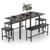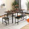 This modern dining table boasts a 63” x 28” tabletop, accommodating 4-6 people with customizable sizing options. The two benches easily slide under the table, making it a space-saving choice. Its smooth surface ensures effortless cleaning with a soft cloth. Supported by sprayed metal pipes, the table offers exceptional strength, holding a weight capacity of 660 lbs. The sturdy H-shaped frames of the benches provide stability for comfortable seating. Corner protectors prevent scratches, while the wood grain tabletop adds a natural touch to your space. Stylish and low-maintenance, this kitchen table set is ideal for apartments, studios, or any space where versatility is essential, delivering a comfortable and chic dining experience.