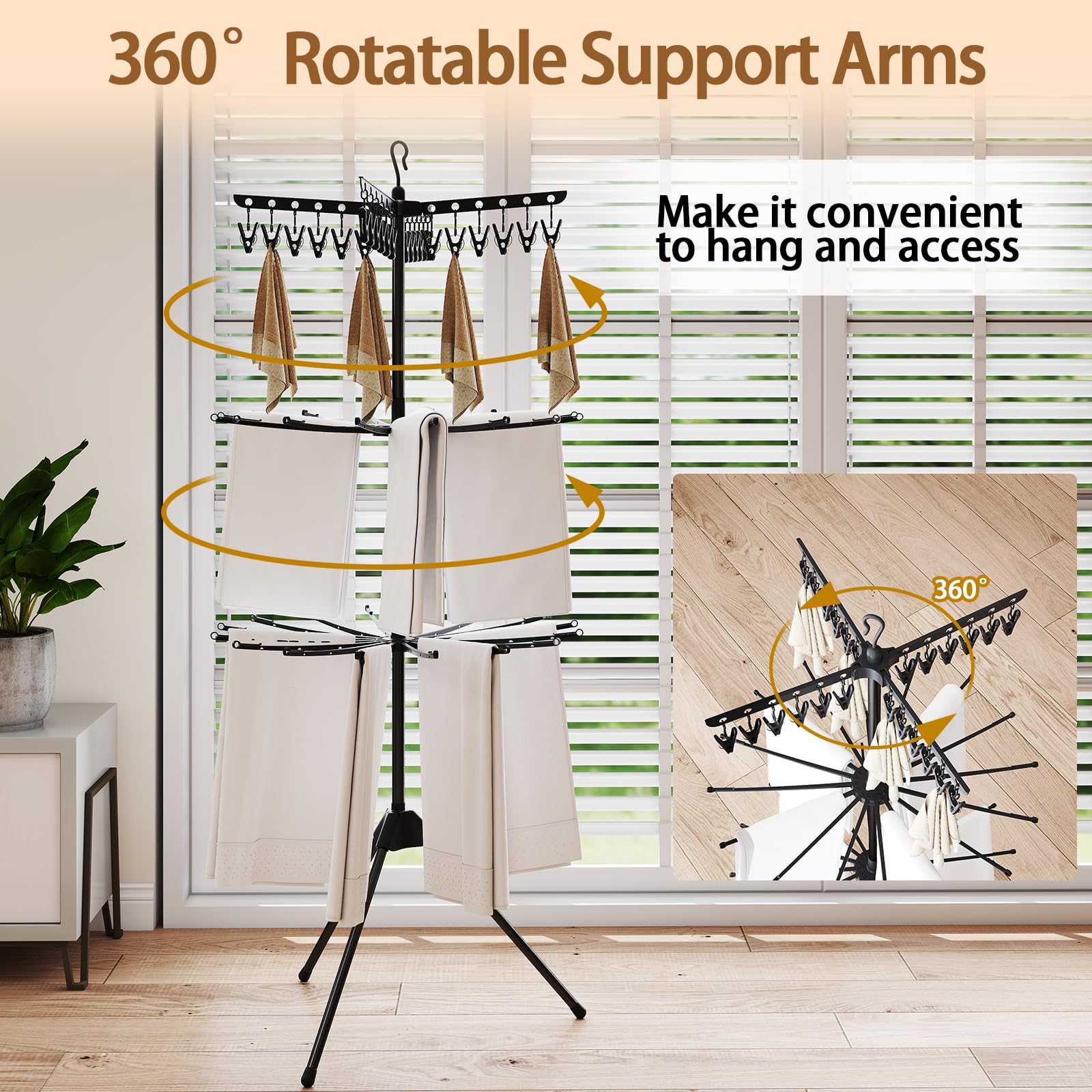 Equipped with 32 hanging rods and 24 removable clips, it offers ample space to dry towels, baby clothes, socks, and more. The 360° rotatable arms allow for easy access. The windproof buckles protect the towel from falling. Additionally, the top clip rack can be completely detachable, which also serves as a hanger. You can place it in your laundry room or on your balcony. Furthermore, the foldable structure helps you easily take it down and store it in any corner to save space.