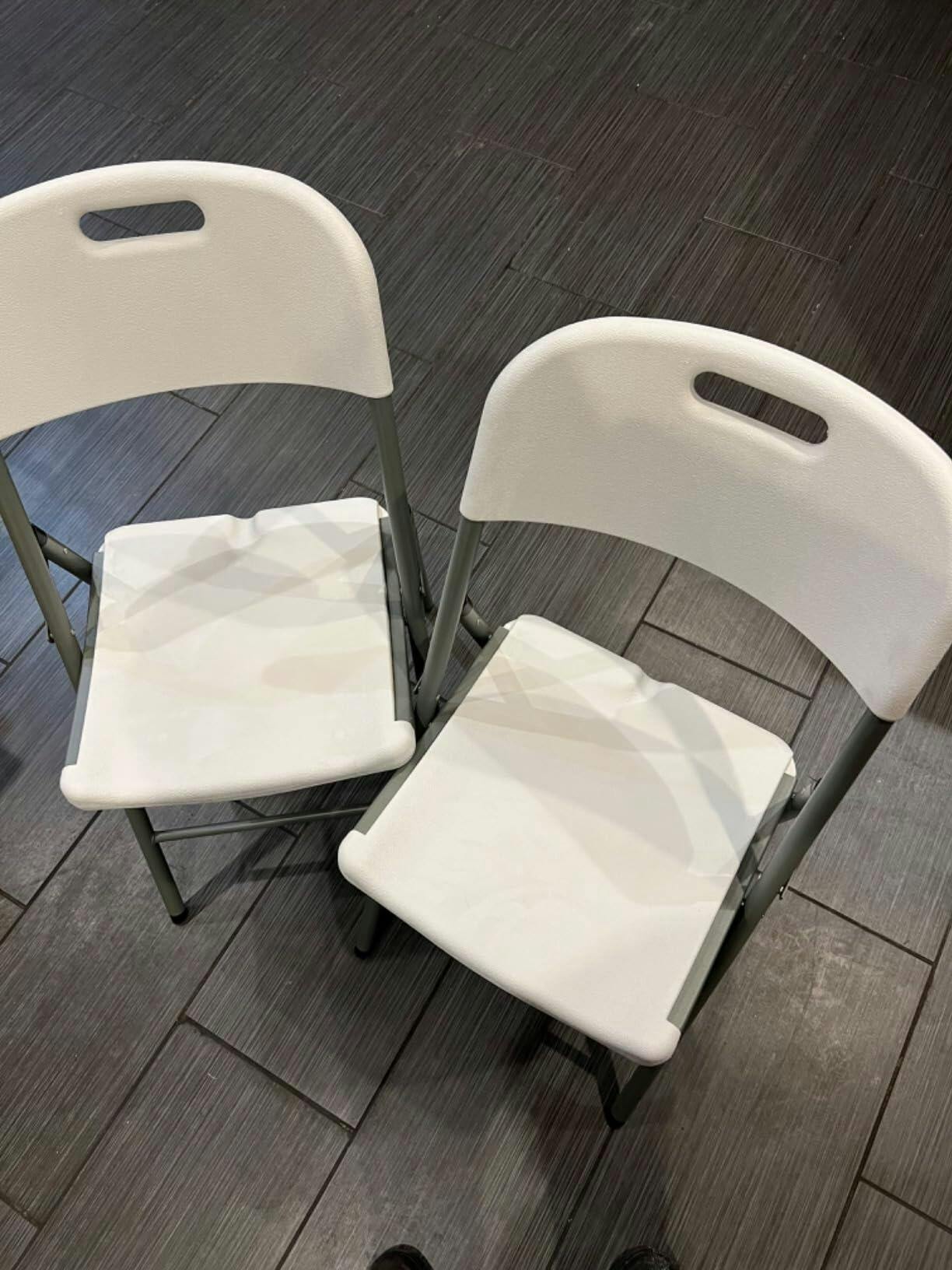 These foldable chairs are easily portable and super efficient! There is a handle that you can use when moving them which makes it easy to use anywhere youd like. I saved so much space with these chairs and I really like the simple design. I highly recommend this chair for its price!