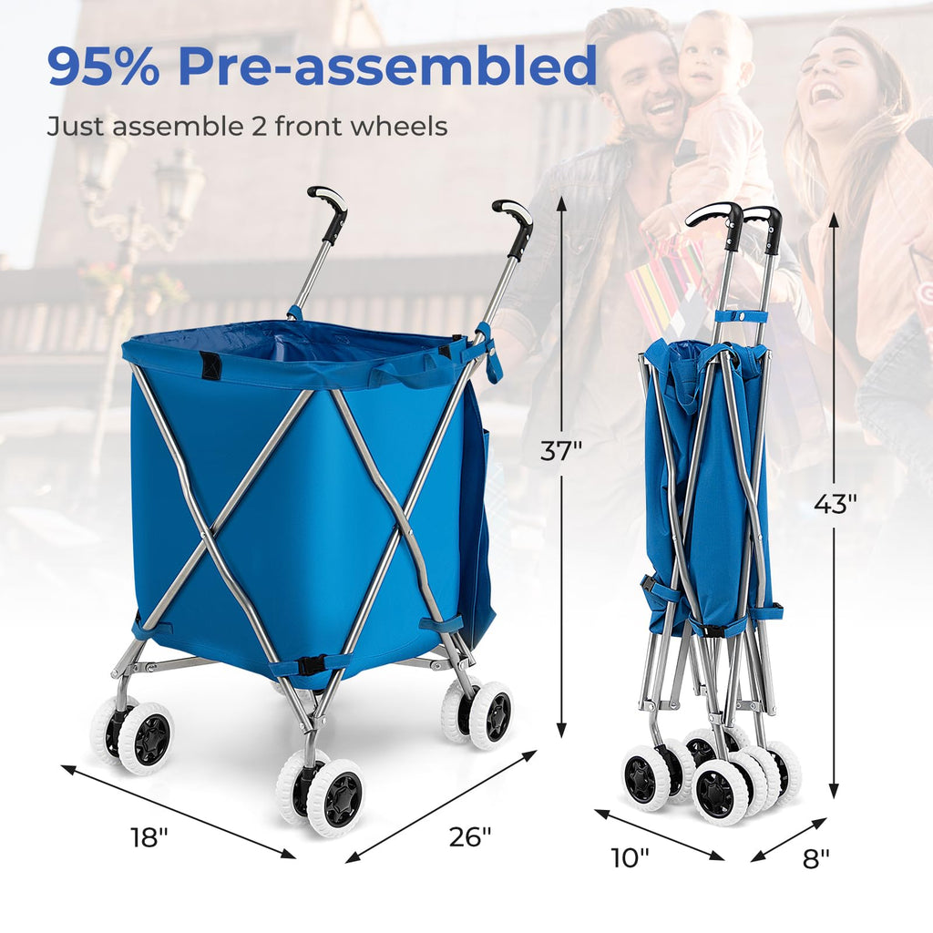 Whether you need to bring home groceries, carry laundry to and from the laundromat or transport other heavy items, this folding shopping cart with is a reliable and practical solution!The removable waterproof Oxford cloth liner is an excellent feature as it keeps your items safe and dry. It is also washable, making it easy to clean and maintain. This utility cart is equipped with 4 smooth-rolling wheels that make it easy to maneuver over various surfaces, such as sidewalks and curbs. The front 2 wheels are swivel wheels, offering enhanced maneuverability, while the rear wheels are fixed for stability. In addition, the sturdy metal frame endows this compact grocery cart with 120 lbs weight capacity to handle heavy loads without any issues. The simple folding mechanism allows for easy storage and transportation, making it ideal for those with limited storage space.