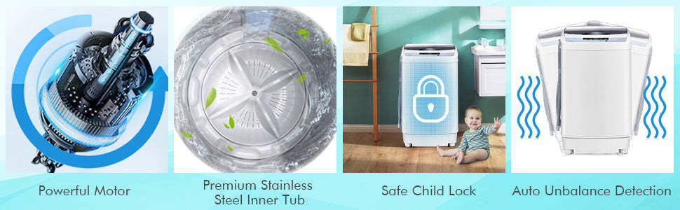 • Child Lock for Safety: Different from other washing machines, this portable washer is equipped with a child lock in order to prevent your kid from using it accidentally. The operation is quite easy. All you need to do is press the buttons of “water level/spin” and “program/delay” at the same time above 3 seconds to set the child lock.
