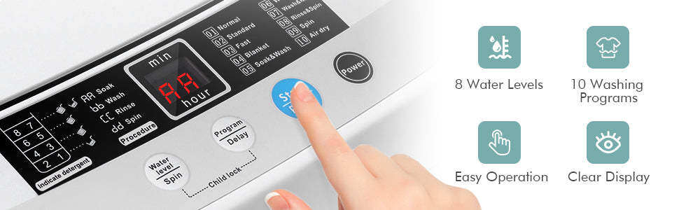 • Easy to Use: Coming with 10 programs and 8 water levels, this premium washing machine is convenient for you to choose the specific mode for your different laundry requirements. Besides, the LED display and visible lid allow you to check the time and washing process.