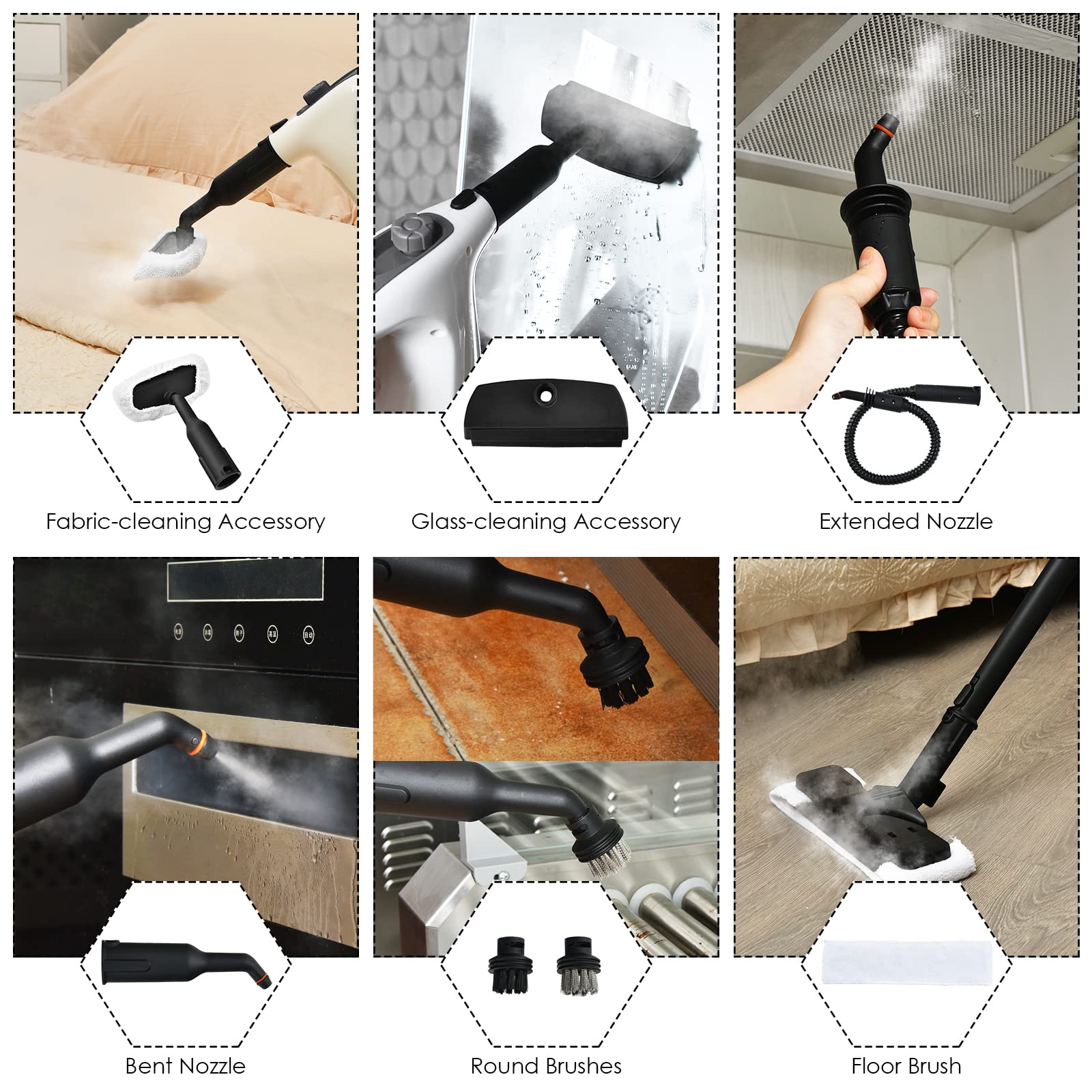 Package Includes: 1 x Steam Cleaner, 1 x Soft Hose, 1 x Measuring Cup, 1 x Small Towel, 1 x Glass Brush, 1 x Big Nozzle, 1 x Stainless Brush, 3 x Nylon Brush, 3 x Extension Tube, 1 x Brush Connector, 1 x Floor Brush, 1 x Glove, 1 x Brush Towel, 1 x Funnel, 1 x Instruction