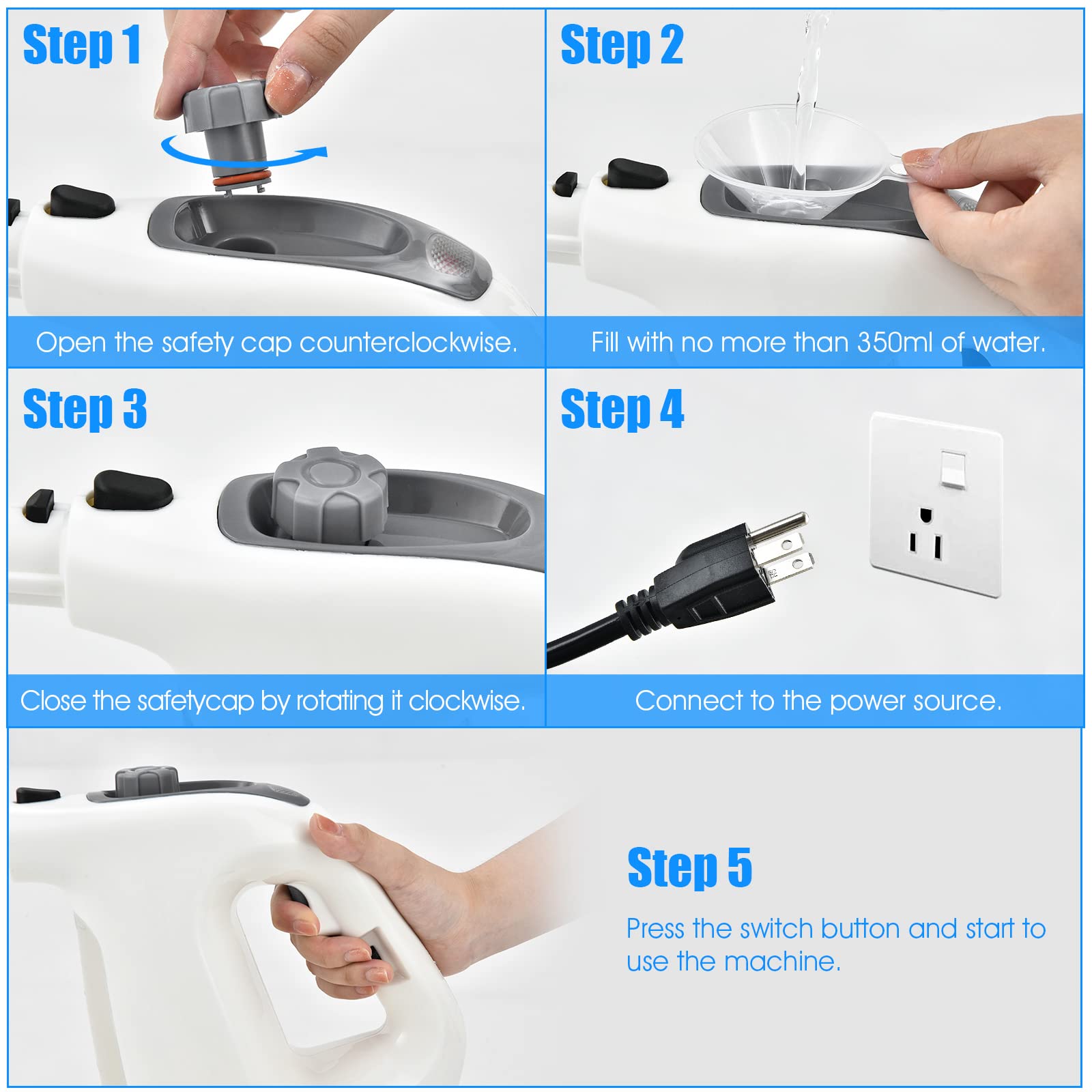 This steam mop cleaner uses powerful high-pressure steam to clean and disinfect. It is suitable for sealed surfaces, and fabrics. Equipped with different types of brush heads and nozzles, the household steamer can penetrate deep into crevices and cracks to eliminate stains and dust. It should be noted that the initial sprayed steam may contain a lot of water droplets, and the steam will return to normal after 3-5 seconds. If you find that the water is running out during cleaning, you are able to add water without cutting off the power supply. To help clean the whole house more quickly and easily, our portable steam cleaner is here waiting for your call!