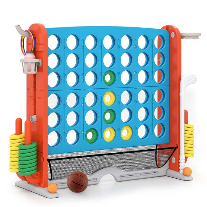Bring the fun home with this jumbo 4-in-a-row game, perfect for backyard parties, family game nights, school events, or rainy-day indoor play. Kids, teens, and adults can enjoy four activities—classic 4-to-Score, basketball shoot, ring toss, and mini golf. The multifunctional backyard game grows with your children, keeping everyone engaged while encouraging teamwork, hand-eye coordination, and friendly competition. Ideal for bonding, breaking up boredom, and bringing energy and laughter to any gathering.