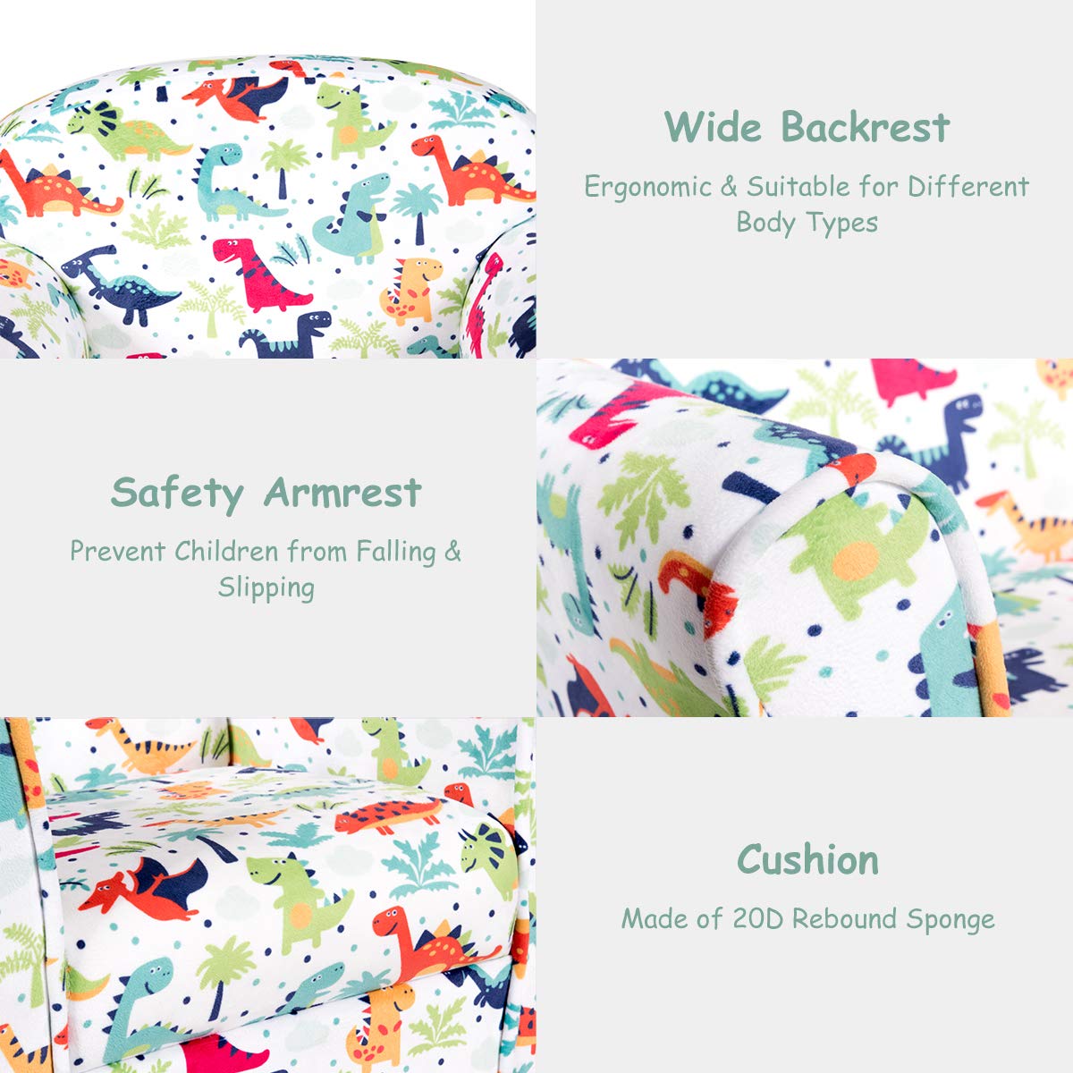 Honey Joy kids sofa is a great gift for your kids and a perfect decoration for your home. The unique design of the cute dinosaur pattern will make the child fall in love with it at a glance. It has a strong wood frame for stability, and high density sponge on the seat and armrests for extra comfort. Durable and lightweight construction makes this sofa the perfect fit for your little one. Your kids can sit on to watch TV or read books in complete comfort. Our sofa is great for entertainment and leisure. It will be your optimal choice.