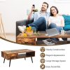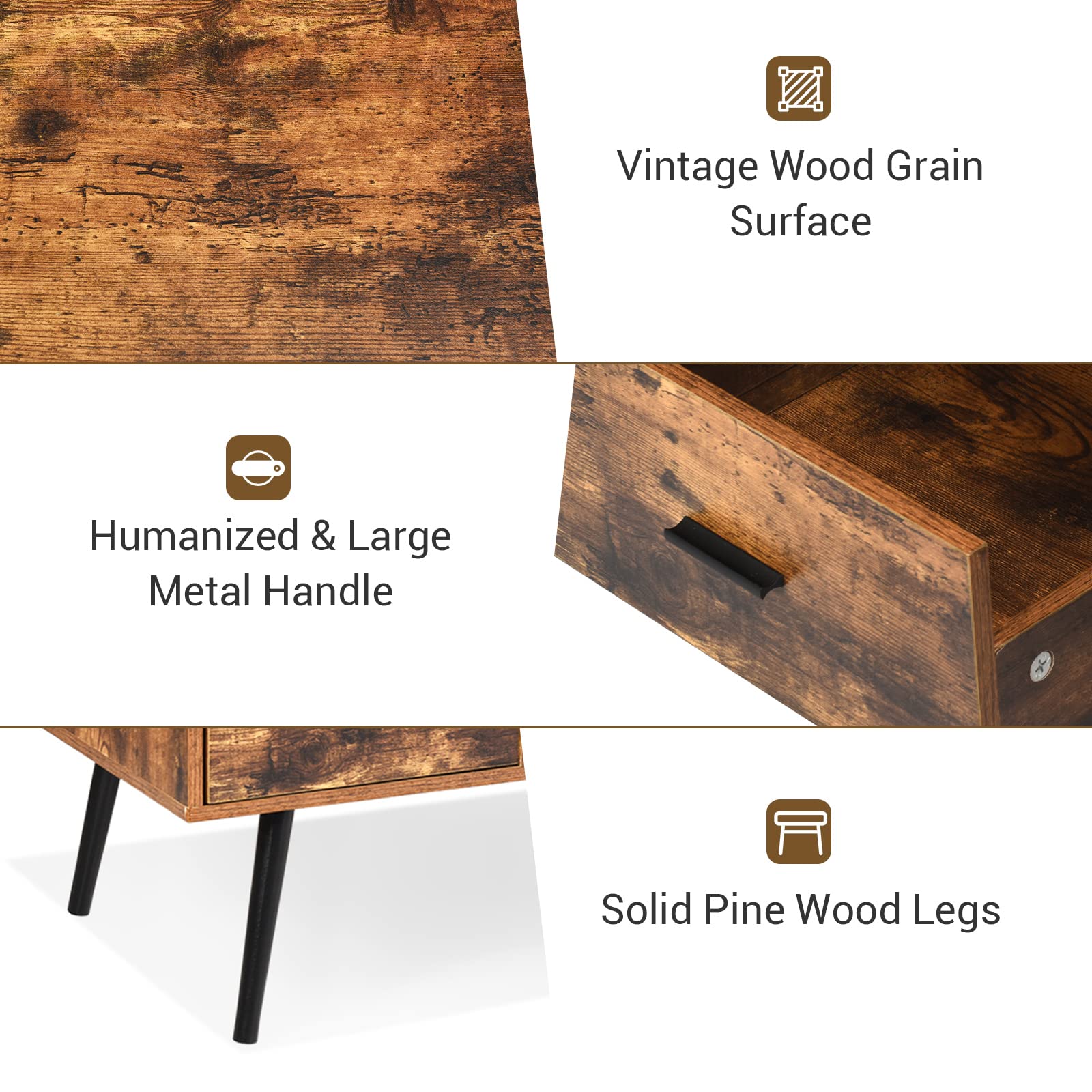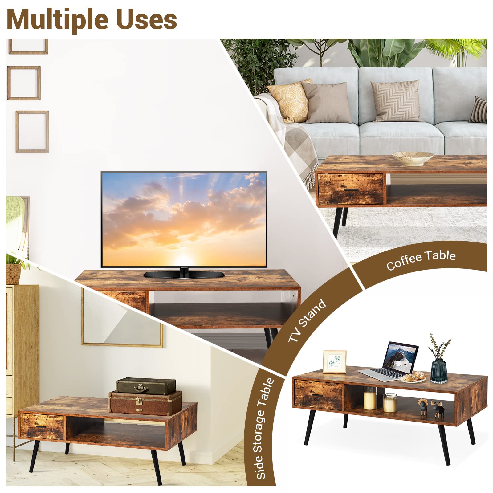 Our exquisitely crafted mid-century coffee table with storage can make your living room well organized and elegant! The rustic brown wood grain surface of the table creates a retro atmosphere, making your room no longer monotonous. The spacious tabletop and open shelf offer ample space to place various daily essentials with easy access, such as photo frames, plants, books, snacks, remote control, etc. Besides, there is a large drawer to provide extra storage space and protect your privacy. The drawer is easy to slide out with the humanized handle. As for quality, this cocktail table is made of premium engineered wood and solid pine wood legs, ensuring great stability and durability. With the exquisite surface treatment, the table has no smell and is easy to clean with damp cloth. This industrial coffee table can not only bring neatness to your home, but also serves as an elegant decor in your living space.