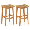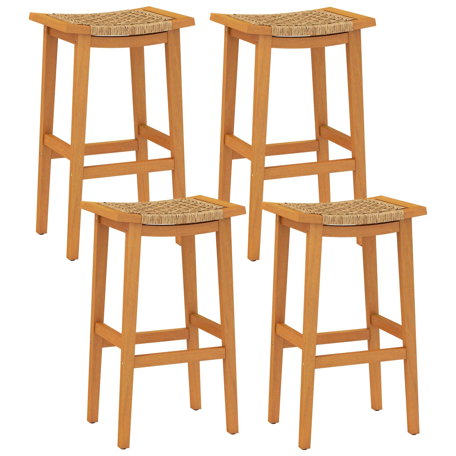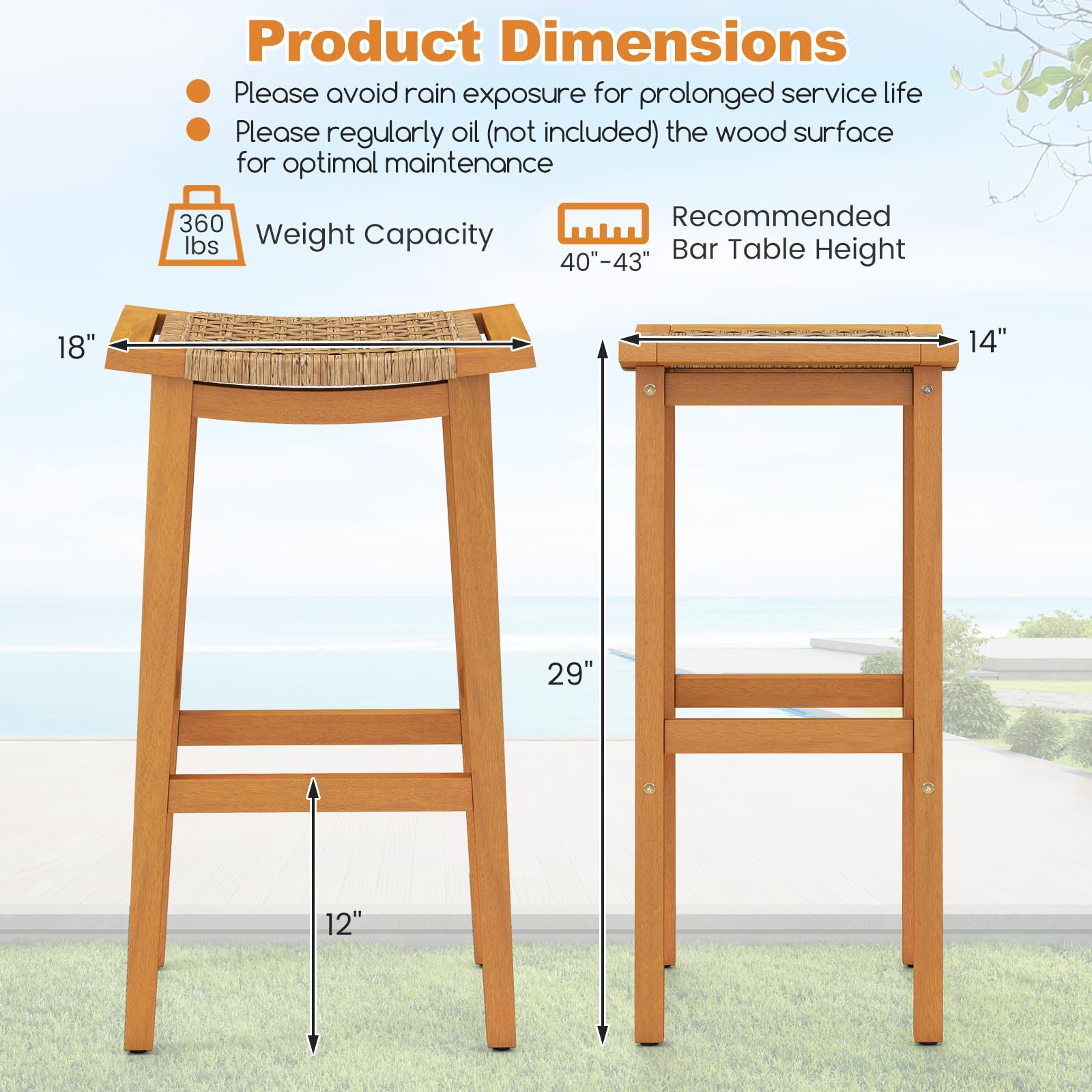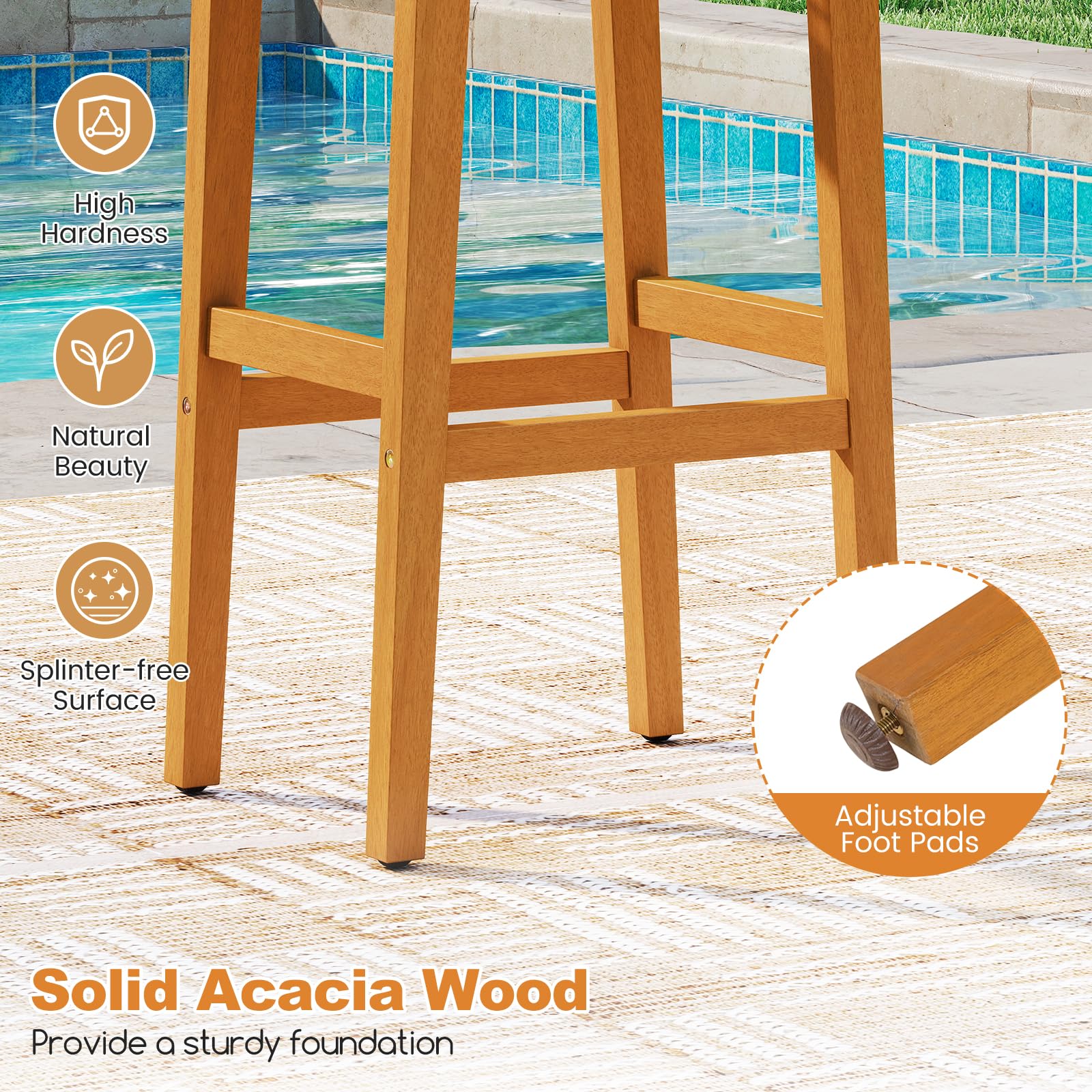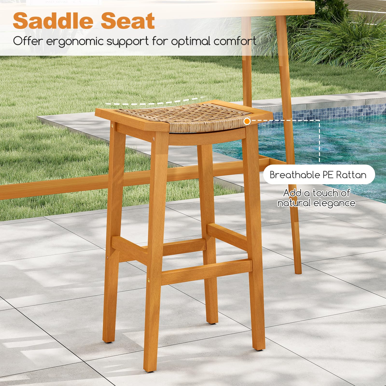 The robust, solid acacia wood structure supports up to 360 lbs per stool and includes adjustable foot pads to ensure stability on uneven surfaces. For enhanced comfort, each bar height patio chair features an ergonomic saddle seat made from breathable PE rattan and a built-in footrest, blending exceptional durability with sophisticated style and natural beauty.