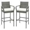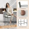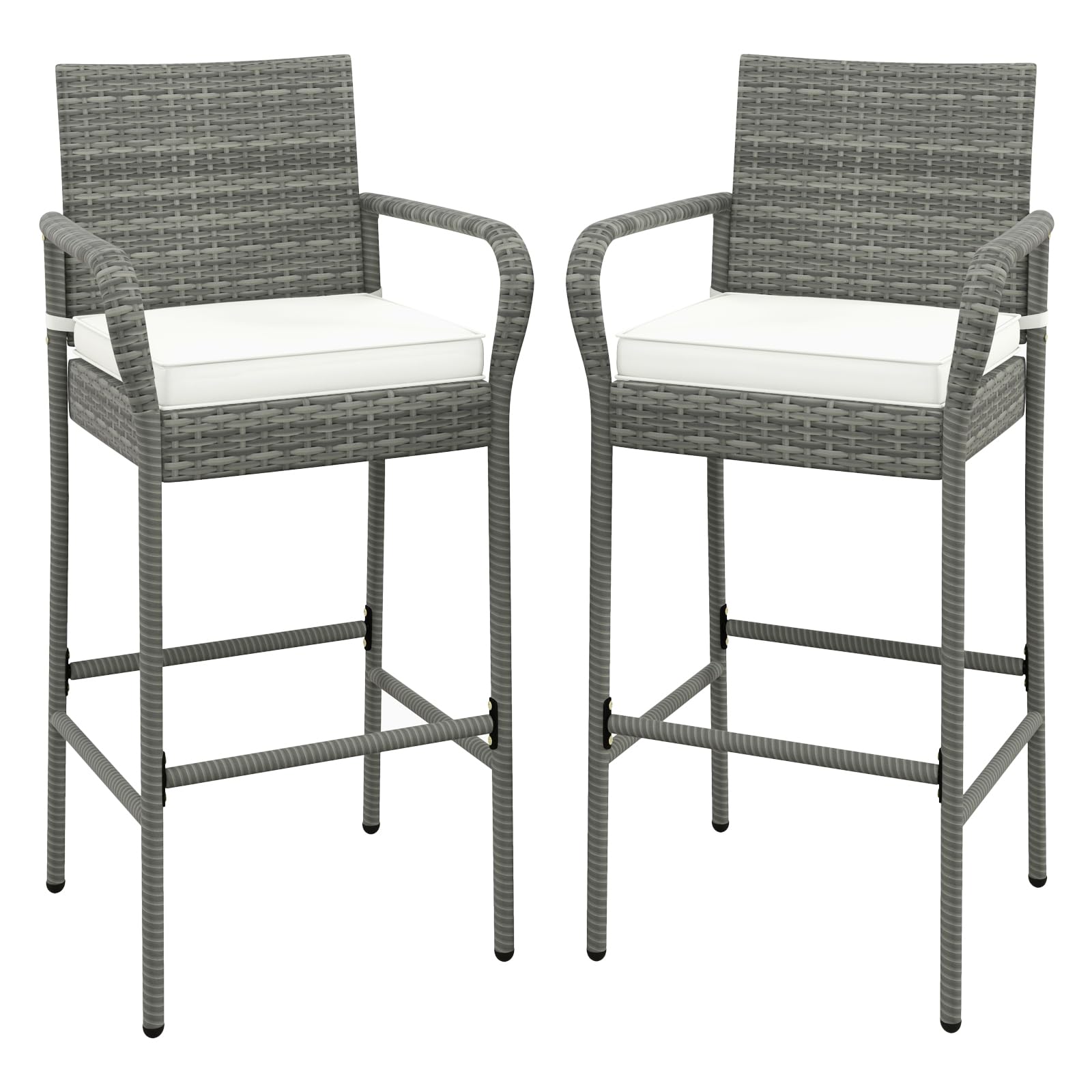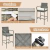 These bar height chairs blend style with durability, creating an inviting ambiance perfect for gatherings. Supported by heavy-duty metal frame, each stool is robust and can bear up to 400 lbs. Moreover, the PE rattan material not only adds a stylish look but also perfect for year-round use. Besides, the plush seat cushions provide a soft, supportive base for extended relaxation. The thoughtful additions of armrests and backrest enhance ergonomic support. Furthermore, the footrest on each stool promotes a relaxed seating position. The elegant wicker bar chairs complement a variety of outdoor spaces, such as patio, poolside, yard, and garden.
