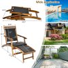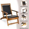 This patio rattan chair is constructed with a solid acacia wood frame and durable PE rattan for longevity. The ergonomic design enhances comfort, providing a delightful seating experience. Easily foldable when not in use, this deck chair comes with a securing hasp for storage and transport convenience. The footrest can be effortlessly tucked under the seat for a classic sitting arrangement. Its simple, rustic design imparts a harmonious and natural touch to any indoor or outdoor setting, be it a deck, porch, backyard, or garden.