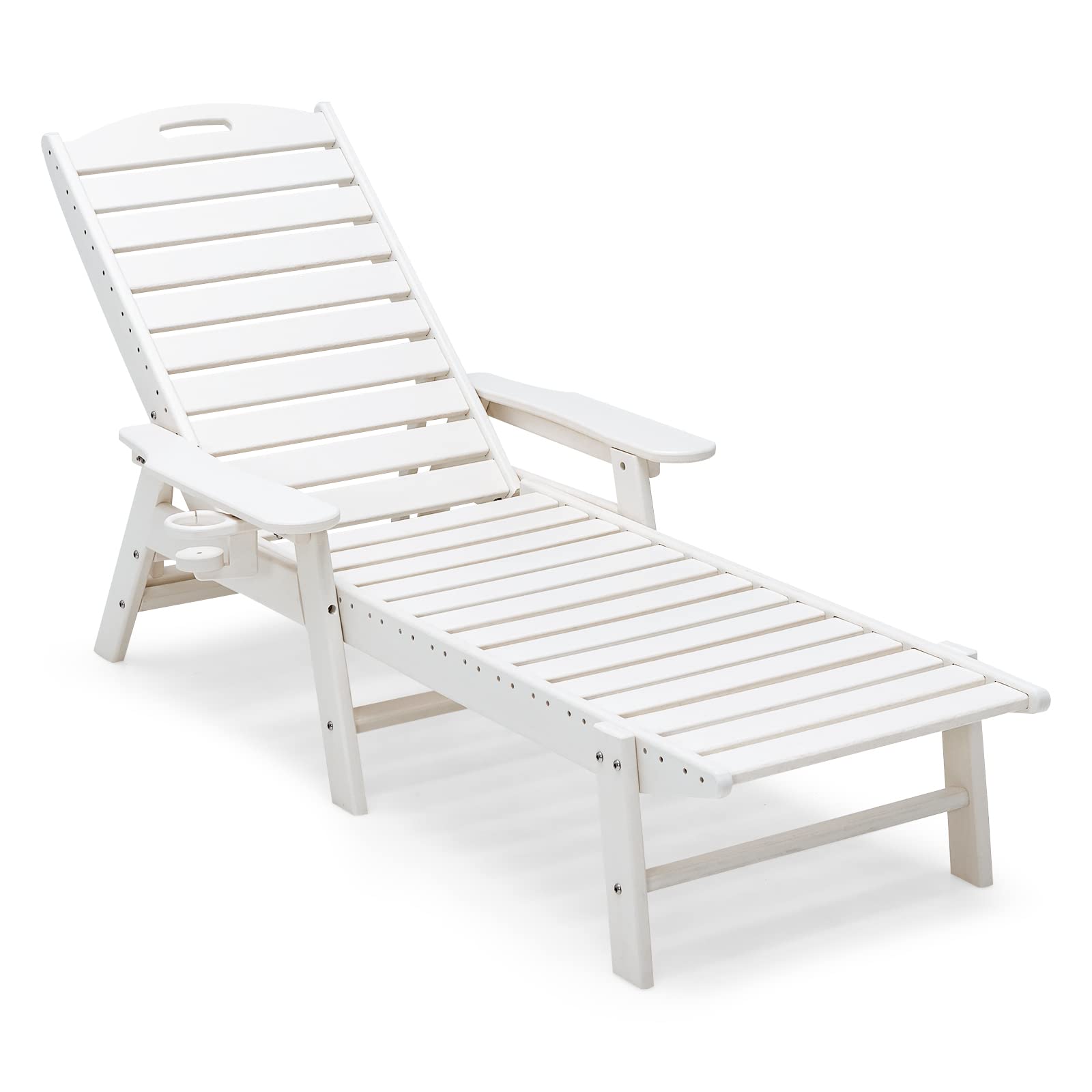 The chaise lounge is totally made of tough high-density polyethylene, which is wear-resistant and weatherproof, ensuring long-lasting service life. And the chair is equipped with high backrest which can be adjusted to 5 positions, allowing you to take a nap, read a book, or even sleep without any discomfort. The movable cup holder on the side is convenient for you to drink water. And the modern white look makes this chaise lounge chair perfectly fit into any environment. It is suitable for the beach, garden, backyard, poolside, balcony, porch and so on.