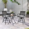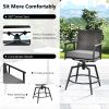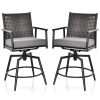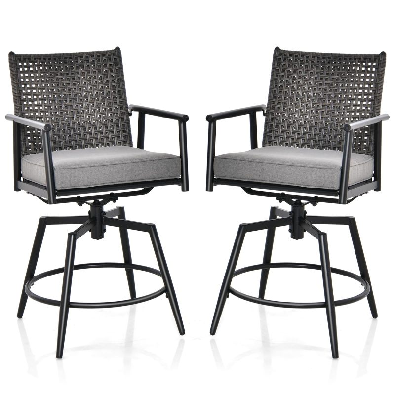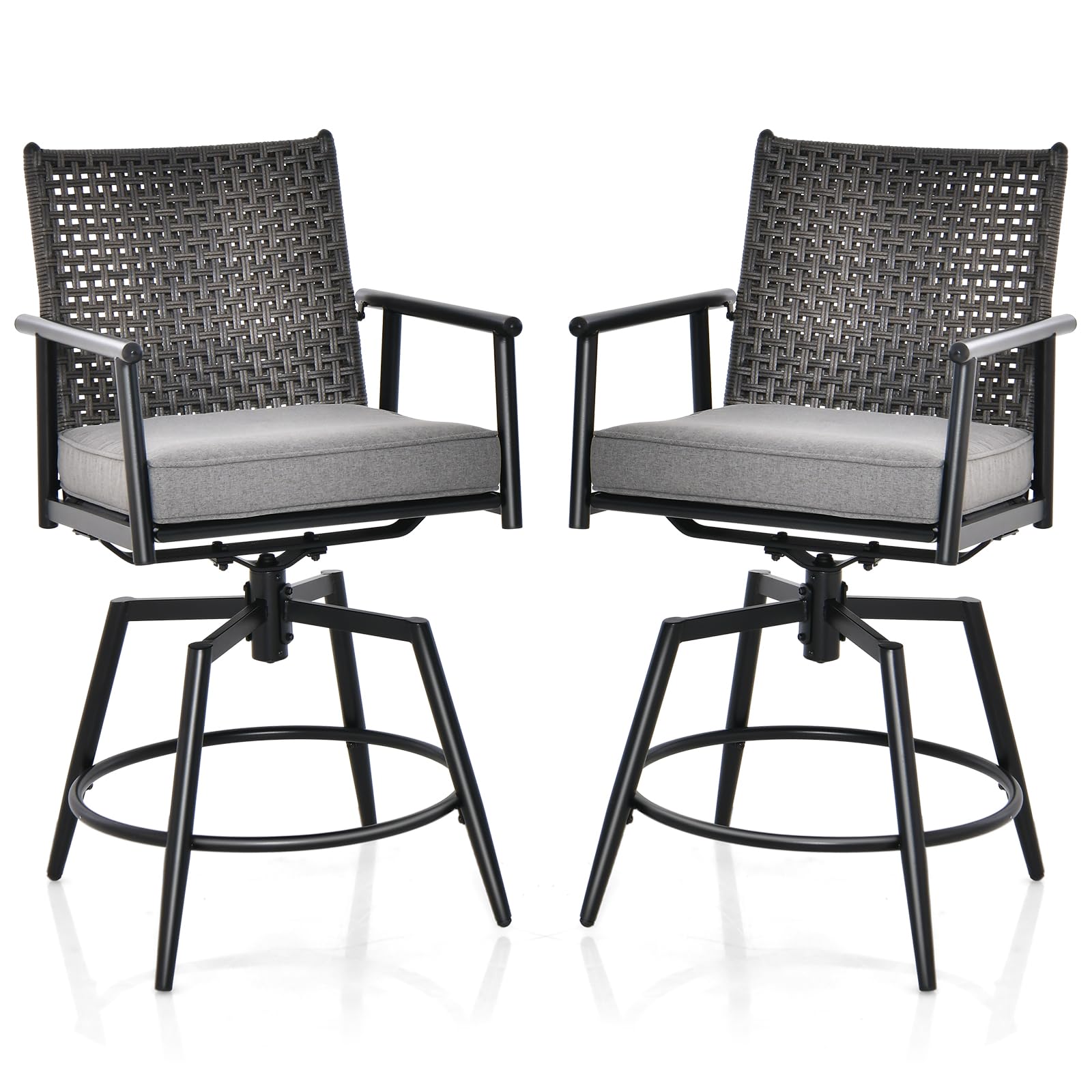 Experience comfort & elegance with this exquisite bar stool set of 2. Its 2-layered PE rattan backrest offers a supportive & stylish touch, allowing you to sit more comfortably. Its premium fabric seat is both breathable & quick-drying, making it perfect for outdoors. Thanks to its removable cushion, which has a hand-washable cover & is padded for exceptional comfort, the cleaning has never been easier. Engage in lively conversations as the 360° swivel seat allows for effortless interaction in any direction. Heightened comfort is achieved with 9.5” high armrests & a 7.5” high footrest. The strong painted metal frame ensures stability & can safely hold weights up to 330 lbs, all while resisting rust. Each bar stool has more considerate details. Adjustable & anti-slip foot pads ensure a secure & balanced seating experience. Versatile & suitable for any outdoor setting, this patio bistro set brings leisure to your garden, balcony, or poolside. Assembly is simplified with its detailed manual. Revel in comfort & elegance with this exceptional bar stool set.
